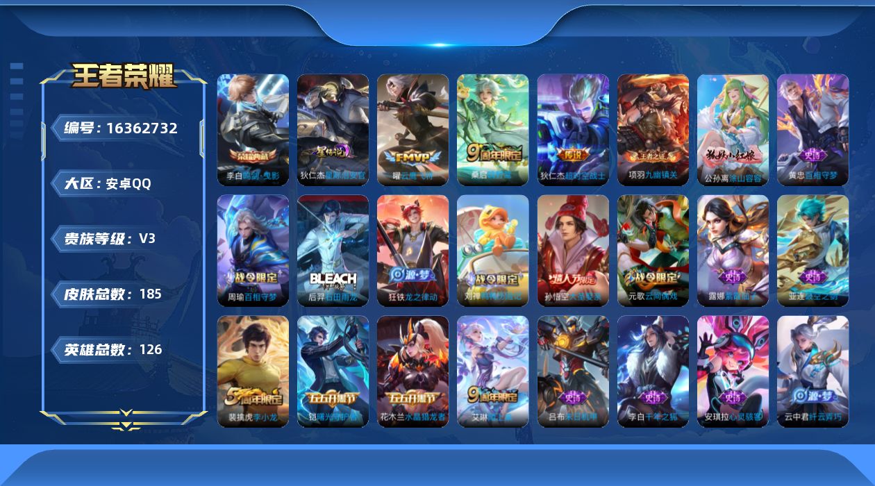 - [13402187]【店主推荐捡漏号!可直接换绑】安卓Q-V10-至尊星耀III段位-126英雄-649皮肤-8典藏-9无双-5珍品传说-104传说-225史诗-7星元 【英雄全皮】:廉颇全皮,墨子全皮,嬴政全皮,刘禅全皮,阿轲全皮,扁鹊全皮,白起全皮,夏侯惇全皮,典韦全皮,李白全皮,达摩全皮,关羽全皮,安琪拉全皮,露娜全皮,刘邦全皮,韩信全皮,花木兰全皮,不知火舞全皮,娜可露露全皮,刘备全皮,虞姬全皮,钟馗全皮,蔡文姬全皮,太乙真人全皮,鬼谷子全皮,大乔全皮,苏烈全皮,沈梦溪全皮,裴擒虎全皮,狂铁全皮,云中君全皮,李信全皮,盾山全皮,孙策全皮,猪八戒全皮,嫦娥全皮,马超全皮,曜全皮,鲁班大师全皮,蒙恬全皮,澜全皮,盘古全皮,阿古朵全皮,夏洛特全皮,司空震全皮,金蝉全皮,赵怀真全皮,戈娅全皮,空空儿全皮,影全皮,海诺全皮,姬小满全皮 【荣耀典藏】:武则天英雄,夏侯惇无限飓风号,孙尚香杀手不太冷,李白鸣剑曳影,诸葛亮星域神启,花木兰九霄神辉,关羽赤影疾锋,韩信弑枪猎影,虞姬神鉴启示录 【无双皮肤】:妲己青丘九尾,瑶真我赫兹,李白碎月剑心,小乔时之魔女,韩信群星魔术团,不知火舞花合斗,公孙离离恨烟,甄姬雪境奇遇,曜器灵螭龙剑 【珍品传说】:马可波罗怪盗基德,鲁班七号江户川柯南,孙策时之奇旅,嫦娥器灵落星盏,安琪拉酷洛米之心 【传说皮肤】:公孙离云诺千山,西施续相思,杨玉环星之鸣奏,后羿千劫归真,司空震愿照山河定,女娲愿照千秋盛,妲己愿照众生和,澜愿照九州拓,蔡文姬愿照福禄聚,虞姬愿照岁时盈,云缨幻光神枪,裴擒虎祥瑞亨通,嬴政玄雷天君,王昭君映山客,桑启鸣野蒿,庄周牧神诗旅,夏侯惇霜北刀,铠冥王哈迪斯,朵莉亚心动手记,云中君群星魔术团,墨子黄金天蝎座,海月金乌负日,亚连落雪白狼,吕布曦玄引,貂蝉曦玄引,典韦战鼓燎原,孙尚香乘龙问璇玑,孙策乘龙淬吴钩,赵云乘龙铭钟鼎,马超琥珀纪元,铠琥珀纪元,澜逐花归海,艾琳觅芳踪,露娜霜月吟,大乔时之奇旅,兰陵王影龙天霄,云缨鹤归松栖,上官婉儿妄想奇谈,马可波罗妄想实况,东皇太一灼幽烈阳,诸葛亮鹤羽星尊,澜电玩雷克斯,亚瑟追逃游戏,安琪拉追逃游戏,张飞百相守梦,夏洛特浮生妄,干将莫邪画中仙,花木兰燃星之曲,虞姬无限倾心,项羽无限倾心,伽罗炽翼辉光,孙悟空齐天大圣,小乔山海琳琅生,曜山海苍雷引,李信山海炽霜斩,吕布怒海麟威,李白诗剑行,不知火舞绯月行,王昭君