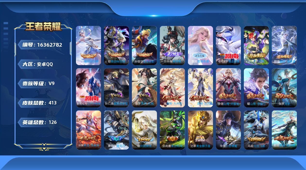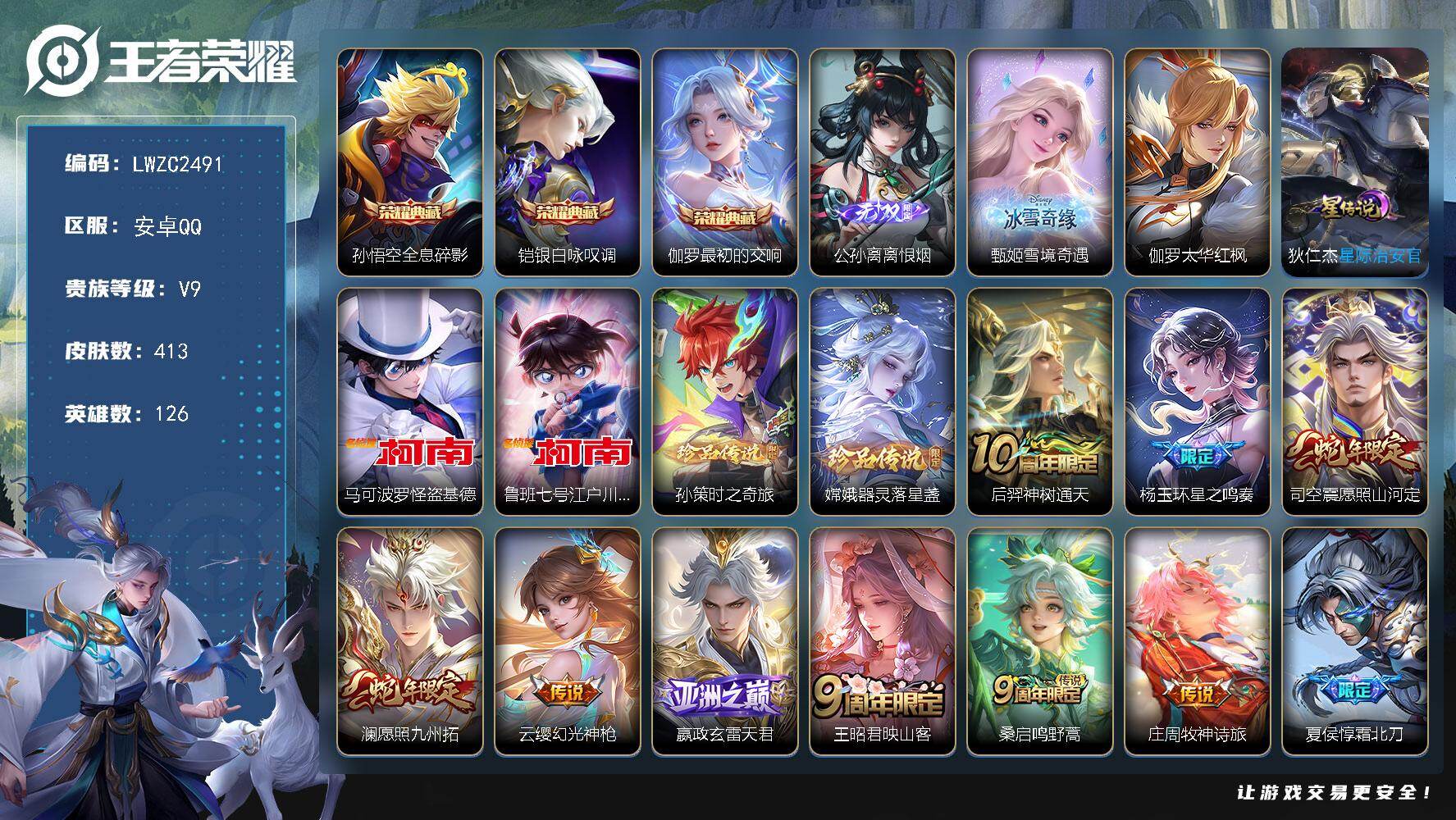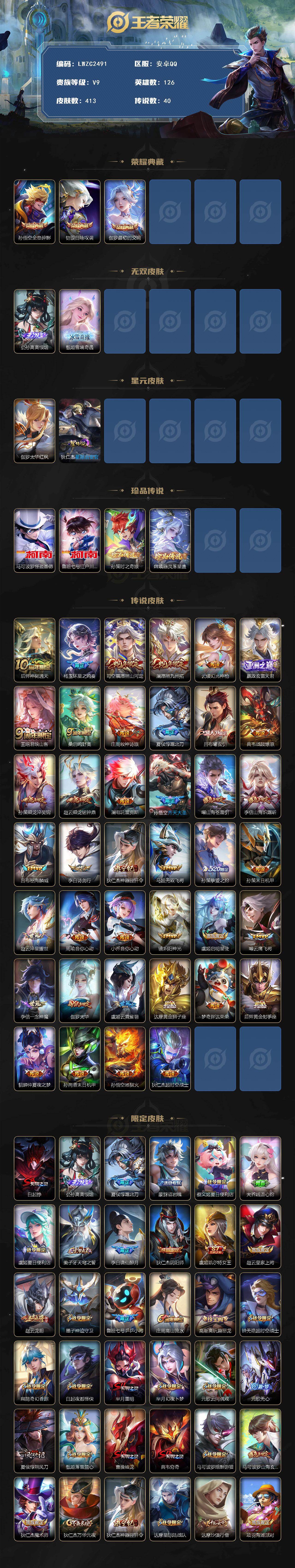 [16362782]【店主推荐捡漏号!可直接换绑】安卓Q-V9-永恒钻石III段位-126英雄-413皮肤-3典藏皮肤-2无双-4珍品传说-40传说-128史诗-2星元