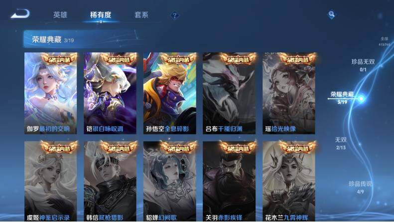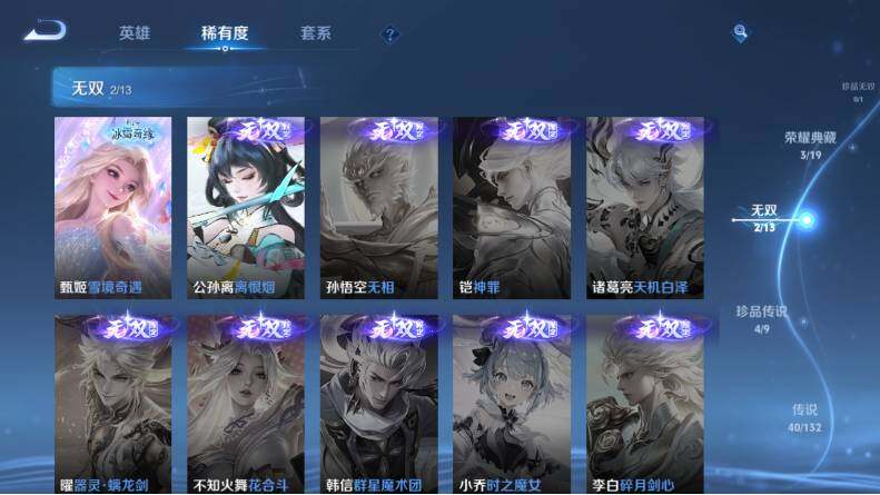 虞姬凯尔特女王,白起狰,太乙真人饕餮,曹操烛龙,芈月重明,典韦穷奇,狂铁御狮,米莱狄御霄,牛魔御旌,盾山御銮,夏侯惇朔风刀,明世隐疑决卦,老夫子醍醐杖,鬼谷子原初探秘者,狄仁杰万华元夜,程咬金演武夺筹,钟馗驱傩正仪,苏烈千军破阵,沈梦溪星空之诺,李元芳银河之约,马可波罗暗影游猎,蒙犽狂想玩偶喵,元歌云间偶戏,弈星混沌棋,达摩沙漠行僧,兰陵王金庭之子,沈梦溪大漠名商,李元芳云中旅人,桑启海盐诗旅,裴擒虎擒涛扼浪,鲁班大师探海日志,张良古海寻踪,项羽苍威无极,镜青焰无极