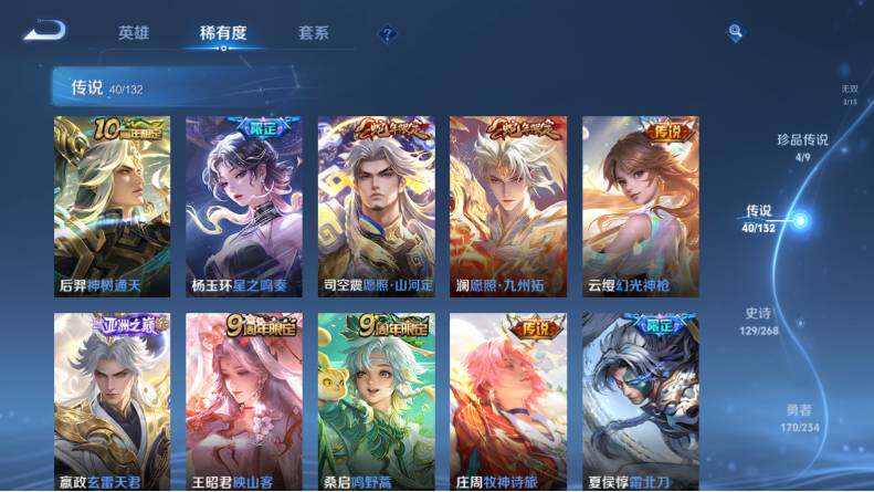 【传说皮肤】:后羿神树通天,杨玉环星之鸣奏,司空震愿照山河定,澜愿照九州拓,云缨幻光神枪,嬴政玄雷天君,王昭君映山客,桑启鸣野蒿,庄周牧神诗旅,夏侯惇霜北刀,吕布曦玄引,典韦战鼓燎原,孙策乘龙淬吴钩,赵云乘龙铭钟鼎,澜电玩雷克斯,孙悟空齐天大圣,曜山海苍雷引,李信山海炽霜斩,吕布怒海麟威,李白诗剑行,狄仁杰神器狴犴令,马超无双飞将,孙策挚爱之约,孙策末日机甲,赵云淬星耀世,周瑜音你心动,小乔音你心动,镜炽阳神光,虞姬启明星使,曜云鹰飞将,李信一念神魔,伽罗太华,虞姬云霓雀翎,达摩黄金狮子座,梦奇胖达荣荣,后羿黄金射手座,貂蝉仲夏夜之梦,孙尚香末日机甲,孙悟空地狱火,狄仁杰超时空战士