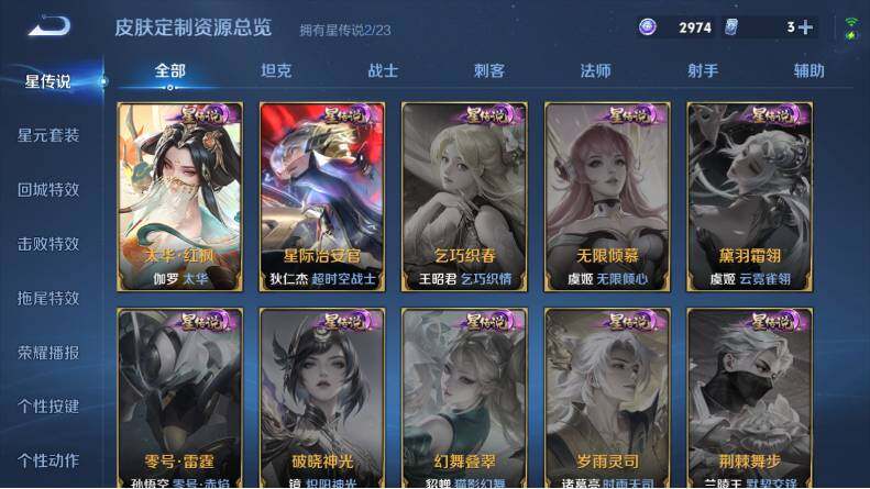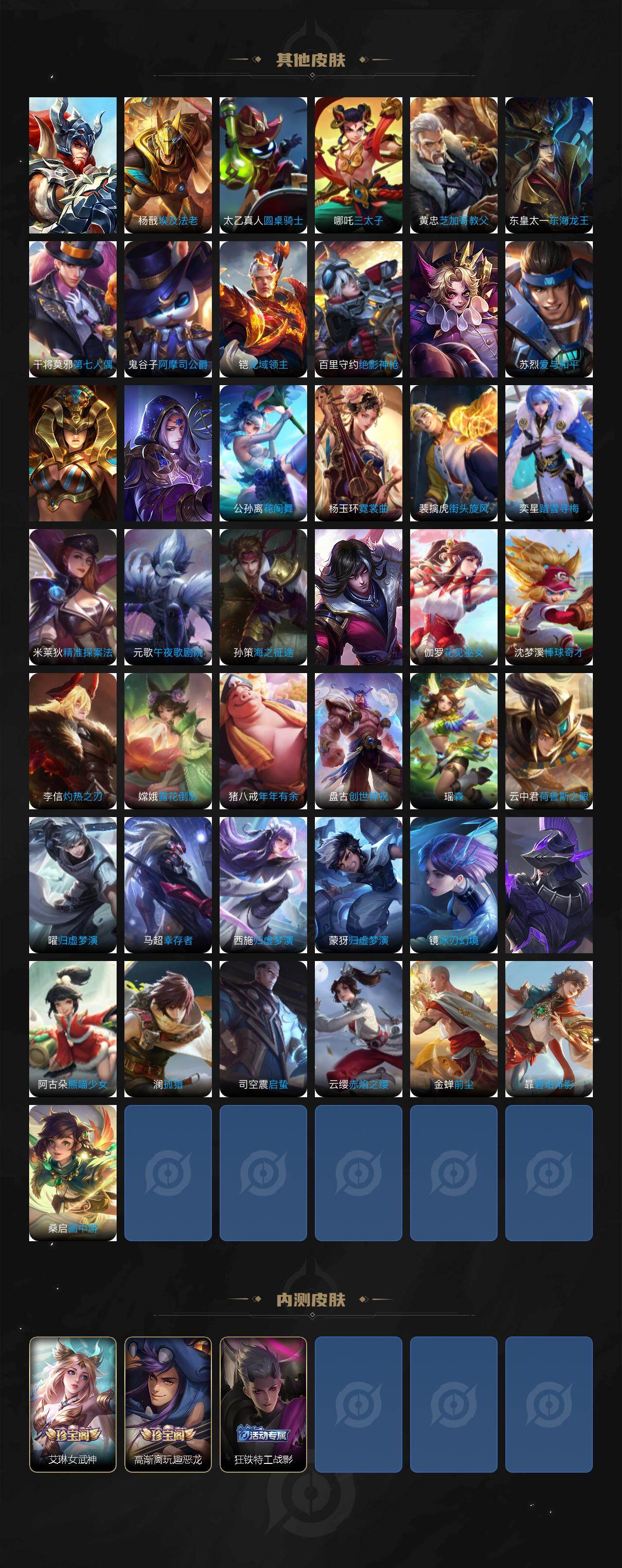 裴擒虎李小龙,赵云龙胆,韩信飞衡,伽罗太华,上官婉儿天狼绘梦者,伽罗天狼溯光者,孙悟空至尊宝,鲁班七号乒乒小将,孙悟空孙行者,杨玉环寅虎·心曲,公孙离玉兔公主,盾山梦圆繁星,李白诗剑行,马可波罗山海·玄木吟,夏侯惇霜北刀,桑启鸣野蒿,艾琳陌上桑,王昭君映山客,澜愿照·九州拓,司空震愿照·山河定