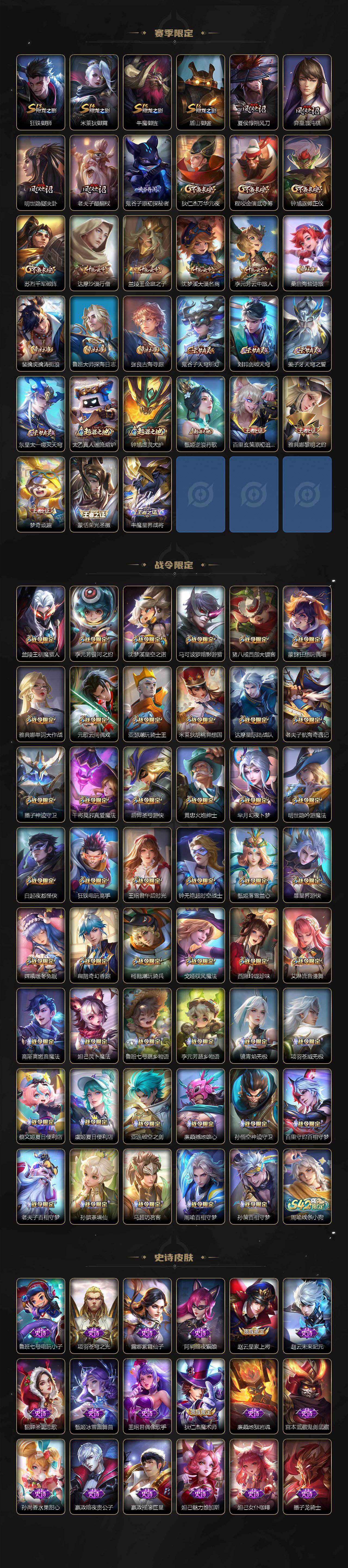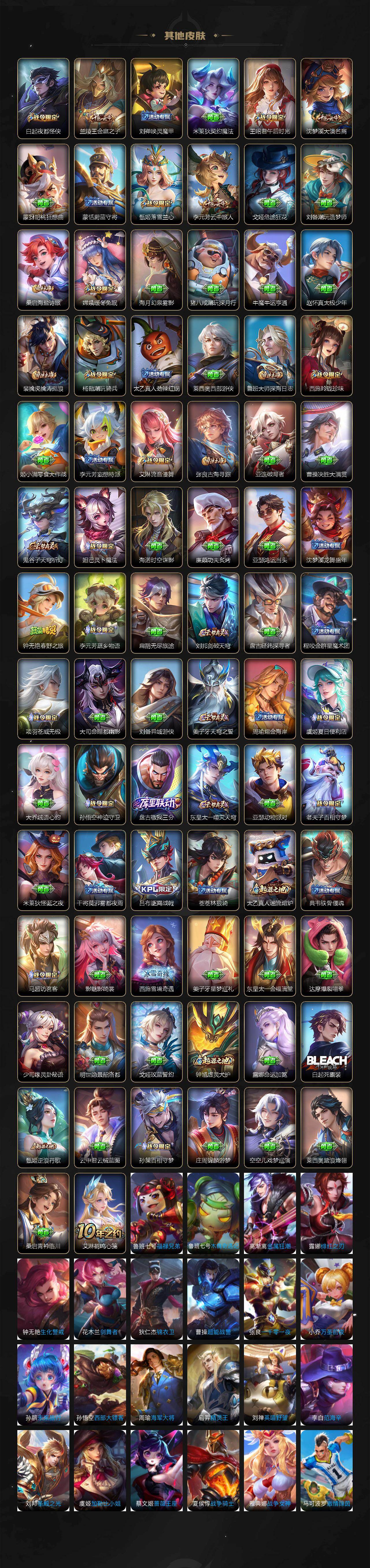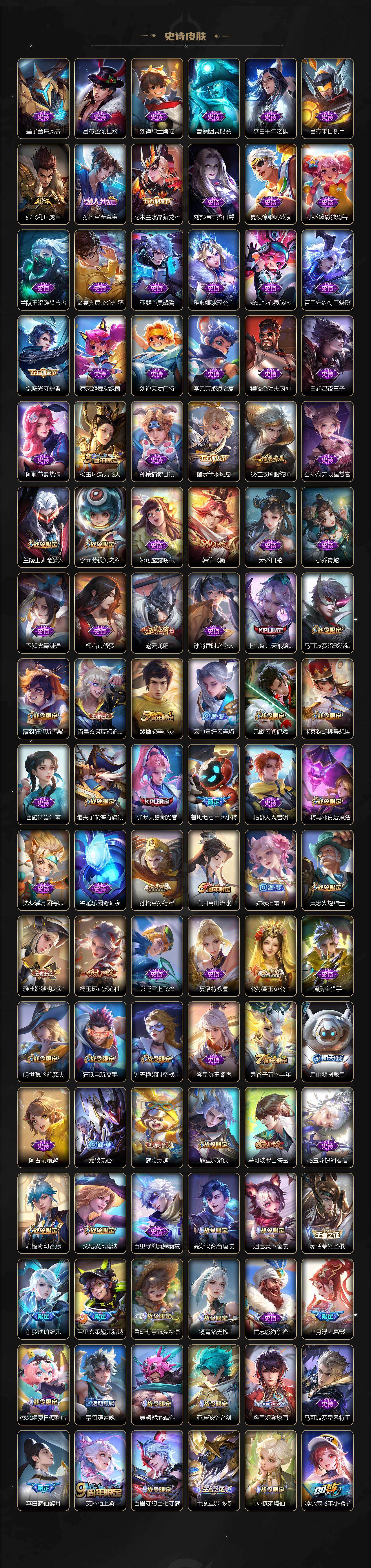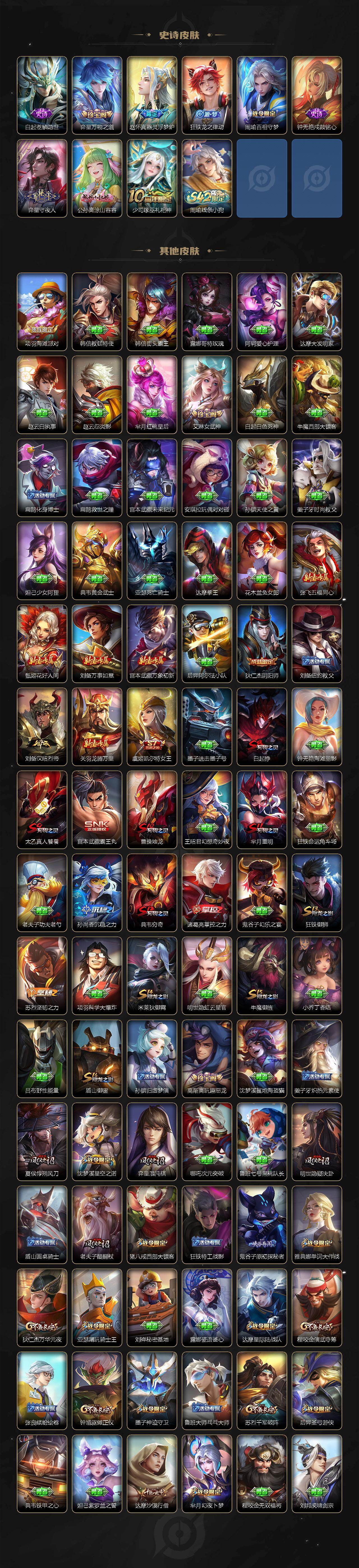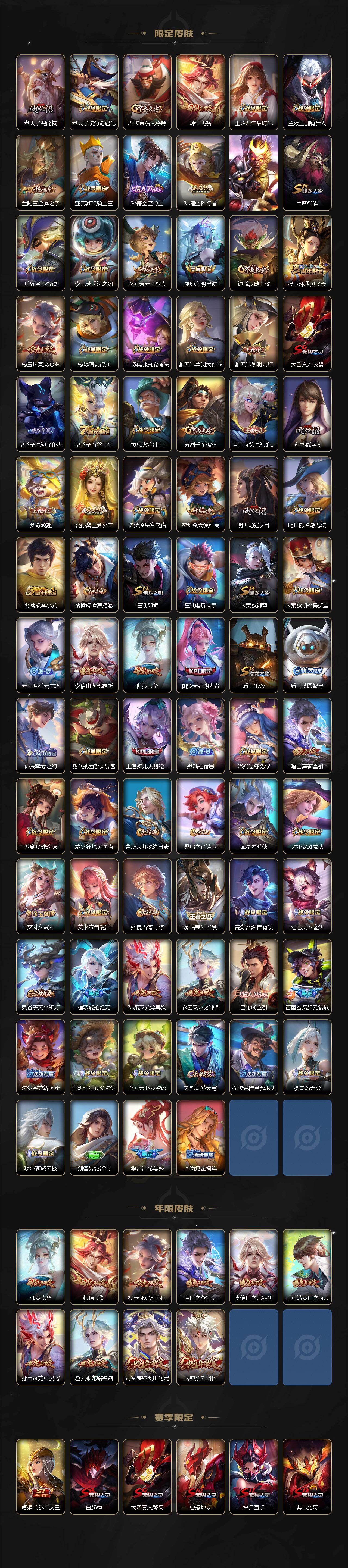 【限定皮肤】:白起狰,公孙离离恨烟,夏侯惇霜北刀,蒙犽顽岩魄,蔡文姬夏日便利店,大乔绒语心约,虞姬夏日便利店,姜子牙天穹之誓,李白谪仙醉月,狄仁杰阴阳师,虞姬凯尔特女王,赵云皇家上将,赵云龙胆,墨子神迹守卫,鲁班七号乒乒小将,庄周高山流水,高渐离玩趣恶龙,钟无艳超时空战士,扁鹊奇幻香踪,白起夜都怪侠,芈月重明,芈月幻夜卜梦,元歌云间偶戏,元歌无心,夏侯惇朔风刀,甄姬落雪兰心,曹操烛龙,典韦穷奇,马可波罗暗影游猎,马可波罗山海玄木吟,狄仁杰魔术师,狄仁杰万华元夜,狄仁杰神器狴犴令,达摩星际陆战队,达摩沙漠行僧,项羽海滩派对,老夫子醍醐杖,老夫子航海奇遇记,程咬金演武夺筹,韩信飞衡,王昭君午后时光,兰陵王驯魔猎人,兰陵王金庭之子,亚瑟潮玩骑士王,孙悟空至尊宝,孙悟空孙行者,孙悟空齐天大圣,牛魔御旌,后羿圣弓游侠,李元芳银河之约,李元芳云中旅人,虞姬启明星使,钟馗驱傩正仪,杨玉环遇见飞天,杨玉环寅虎心曲,杨戬潮玩骑兵,干将莫邪真爱魔法,雅典娜单词大作战,雅典娜黎明之约,太乙真人饕餮,鬼谷子原初探秘者,鬼谷子五谷丰年,黄忠火炮绅士,苏烈千军破阵,百里玄策原初追逐