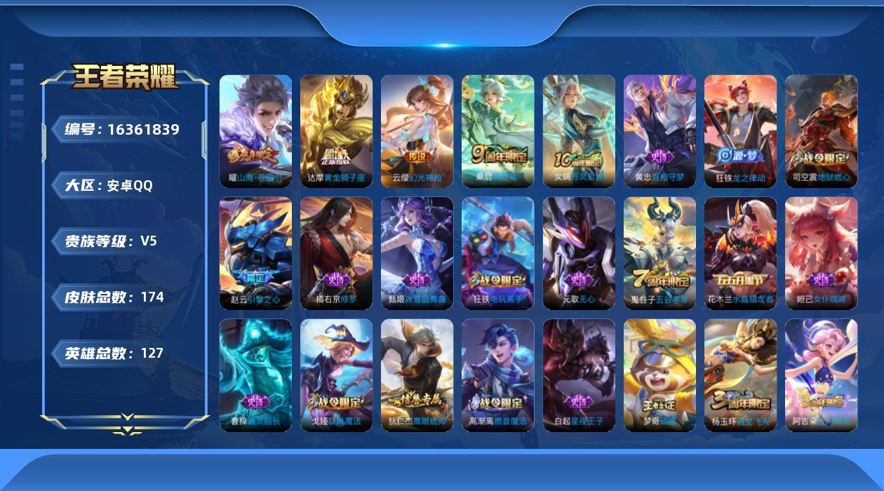 [16361839]【店主推荐捡漏号!可直接换绑】安卓Q-V5-最强王者段位-127英雄-174皮肤-4传说-37史诗