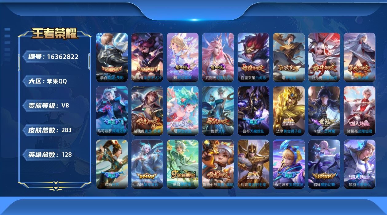 - [12101216]【特价急出/详情看图】:苹果Q-V7-永恒钻石II段位-123英雄-238皮肤-7传说-53史诗 【传说皮肤】:桑启鸣野蒿,孙悟空齐天大圣,李信山海炽霜斩,伽罗太华,貂蝉猫影幻舞,孙尚香末日机甲,吕布天魔缭乱 【限定皮肤】:白起狰,姜子牙天穹之誓,狄仁杰阴阳师,赵云皇家上将,妲己时之彼端,嬴政优雅恋人,嬴政白昼王子,鲁班七号狮舞东方,庄周玄嵩,庄周高山流水,阿轲迷踪丽影,芈月重明,吕布天魔缭乱,吕布猎兽之王,周瑜赤莲之焰,元歌无心,夏侯惇朔风刀,甄姬幽恒,曹操烛龙,典韦穷奇,典韦蓝屏警告,典韦岱宗,马可波罗暗影游猎,狄仁杰魔术师,狄仁杰万华元夜,达摩沙漠行僧,项羽海滩派对,老夫子醍醐杖,程咬金演武夺筹,刘邦夺宝奇兵,韩信飞衡,王昭君凤凰于飞,兰陵王驯魔猎人,兰陵王金庭之子,孙悟空至尊宝,孙悟空齐天大圣,牛魔御旌,后羿如梦令,李元芳银河之约,李元芳云中旅人,钟馗神迹守卫,钟馗驱傩正仪,杨玉环遇见飞天,女娲朔望之晖,干将莫邪胡桃夹子,雅典娜单词大作战,蔡文姬繁星吟游,太乙真人饕餮,鬼谷子原初探秘者,鬼谷子五谷丰年,黄忠烈魂,苏烈千军破阵,弈星混沌棋,沈梦溪星空之诺,沈梦溪大漠名商,明世隐疑决卦,裴擒虎李小龙,裴擒虎擒涛扼浪,狂铁御狮,米莱狄御霄,云中君纤云弄巧,李信山海炽霜斩,伽罗太华,盾山御銮,猪八戒西部大镖客,猪八戒猪悟能,上官婉儿梁祝,嫦娥如梦令,嫦娥拒霜思,蒙犽狂想玩偶喵,鲁班大师探海日志,桑启海盐诗旅,艾琳流音漫舞,司空震地狱燃心,阿古朵江河有灵,张良古海寻踪,蒙犽百解令,鬼谷子天穹祈灯,刘邦剑破天穹,程咬金群星魔术团,周瑜熔金海岸 【年限皮肤】:王昭君凤凰于飞,伽罗太华,甄姬幽恒,韩信飞衡,典韦岱宗,庄周玄嵩,黄忠烈魂,李信山海炽霜斩 【赛季限定】:白起狰,芈月重明,夏侯惇朔风刀,曹操烛龙,典韦穷奇,狄仁杰万华元夜,达摩沙漠行僧,老夫子醍醐杖,程咬金演武夺筹,兰陵王金庭之子,张良古海寻踪,牛魔御旌,李元芳云中旅人,钟馗驱傩正仪,太乙真人饕餮,鬼谷子原初探秘者,苏烈千军破阵,弈星混沌棋,沈梦溪大漠名商,明世隐疑决卦,裴擒虎擒涛扼浪,狂铁御狮,米莱狄御霄,盾山御銮,鲁班大师探海日志,桑启海盐诗旅,鬼谷子天穹祈灯,刘邦剑破天穹,姜子牙天穹之誓 【战令限定】:嬴政白昼王子,鲁班七号狮舞东方,阿轲迷踪丽影,吕布猎兽之王,周瑜赤莲之焰,典韦蓝屏警告,马可波罗暗影游猎,