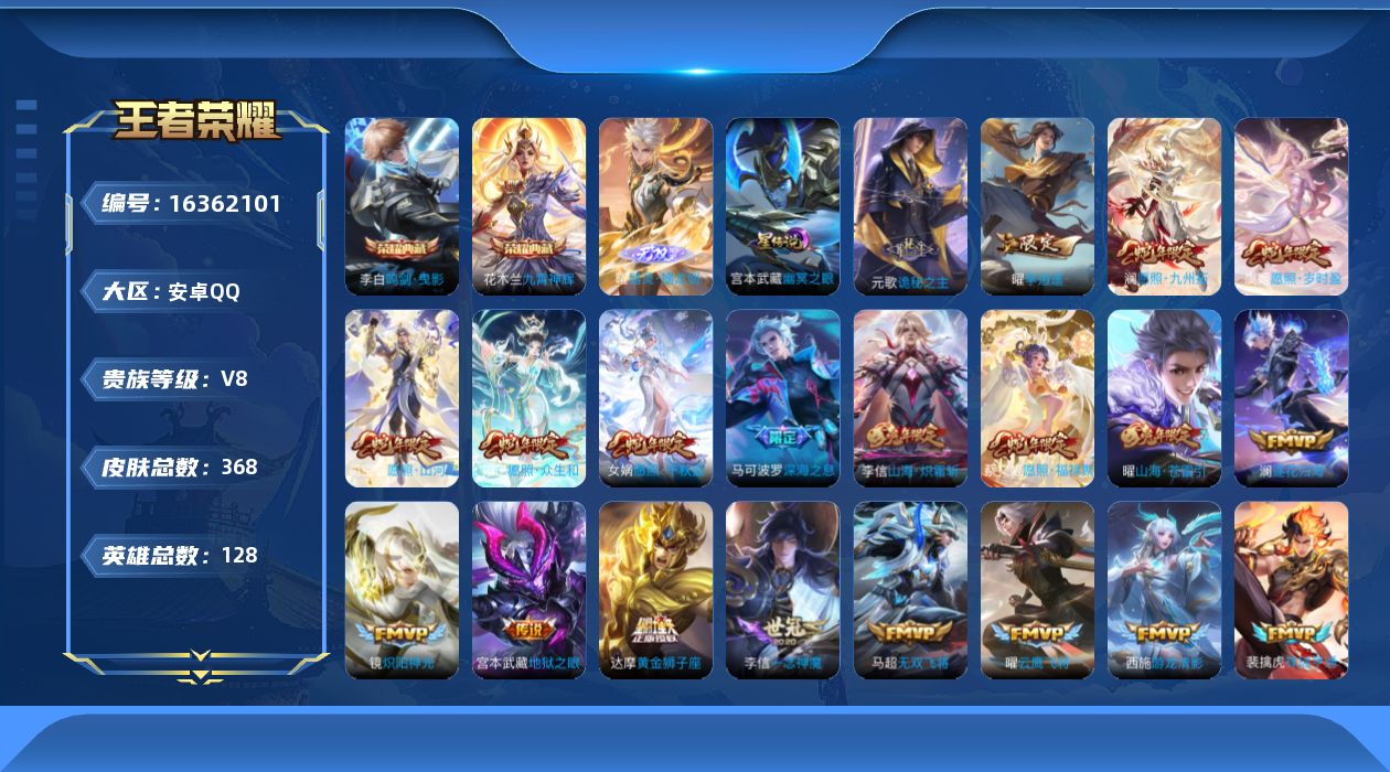 [16362101]【特价急出/详情看图】安卓Q-V8-尊贵铂金III段位-128英雄-368皮肤-2典藏皮肤-1无双-1星元-28传说-113史诗