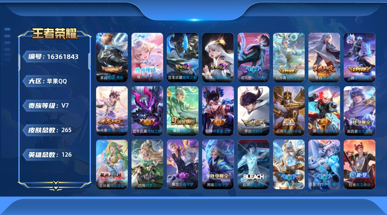 [16361843]【店主推荐捡漏号!可直接换绑】苹果Q-V7-最强王者段位-126英雄-265皮肤-1典藏皮肤-1珍品传说-12传说-82史诗-2星元