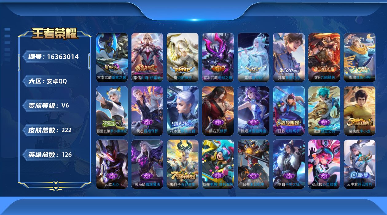 [16363014]可二次【特价出售/店主推荐/1市标】:安卓Q-V6-最强王者段位-126英雄-222皮肤-1星元-5传说-46史诗