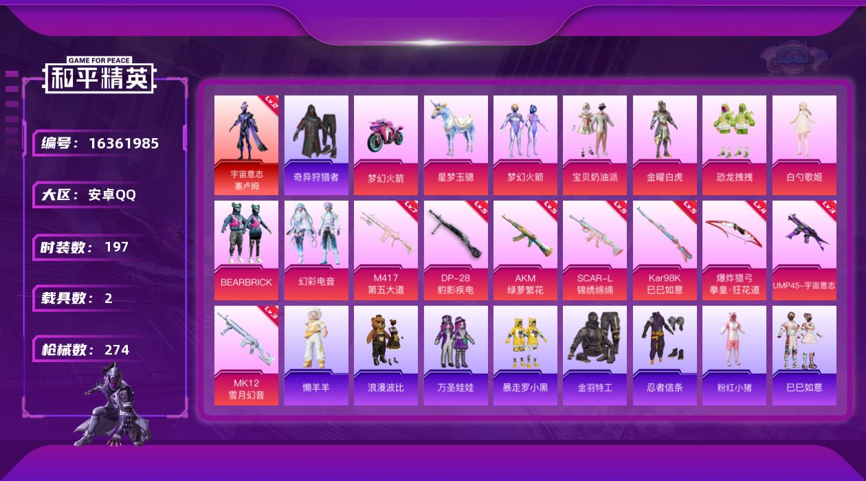 [16361985]【店主推荐捡漏号!可直接换绑】安卓 手Q-1神装-7粉装-8特效枪-2载具-3粉色飞行器-83986热力值-15王牌印记-197套装-274枪皮 【红色神装等级】:宇宙意志-塞卢姆(二级) 【红色角色神装】:宇宙意志-塞卢姆 【热门品类】:粉装-梦幻火箭,套装-奇异狩猎者,套装-金羽特工,套装-忍者信条,套装-浪漫波比,套装-粉红小猪 【粉色套装】:粉装-宝贝奶油派,粉装-金曜白虎,粉装-梦幻火箭,粉装-恐龙拽拽,角色-白勺歌姬,粉装-BEARBRICK,粉装-幻彩电音 【粉色枪皮等级】:AKM-绿萝繁花(五级),SCAR-L-锦绣绵绵(五级),UMP45-宇宙意志(三级),Kar98K-巳巳如意(五级),M417-第五大道(七级),MK12-雪月幻音(三级),DP-28-豹影疾电(五级),爆炸猎弓-拳皇·狂花道(四级) 【粉色载具】:双人摩托-梦幻火箭,星梦玉骢 【粉色枪皮】:AKM-绿萝繁花,SCAR-L-锦绣绵绵,UMP45-宇宙意志,Kar98K-巳巳如意,M417-第五大道,MK12-雪月幻音,DP-28-豹影疾电,爆炸猎弓-拳皇·狂花道 【粉色飞行器】:梦幻火箭飞行器,深渊漩涡飞行器,BEARBRICK飞行器 【粉色降落伞】:幻影战神降落伞,银河战甲降落伞,甜心宝贝降落伞,梦幻火箭降落伞,碧影闪光降落伞,彩虹甜喵降落伞,闲梦青缨降落伞,圣堂之誓降落伞,精灵梦叶罗丽降落伞,墨龙九天降落伞,星梦奇缘降落伞,宇宙意志降落伞,BEARBRICK降落伞,雪月幻音降落伞,圣斗士星矢降落伞,喜羊羊与灰太狼降落伞 【稀有套装】:套装-巳巳如意,套装-雏菊兔兔,套装-萝兰蝴蝶,角色-狂花道·雅典娜,套装-燕燕于飞,套装-鱼渊荷华,套装-风舞幻音,玩偶服-懒羊羊 【稀有枪皮】:AKM-夜灯,AKM-彩虹符号,AKM-深山诡影,AKM-灼热熔岩,AKM-生命誓言,AKM-破晓战魂,AKM-萌趣颜团子,AKM-虎虎生威,AKM-霓虹街区,AKM-龙的传人,M16A4-幻世战舞者,M16A4-甜心亚梦,M16A4-生命誓言,M16A4-红色方程式,M16A4-莲影清波,SCAR-L-夜灯,SCAR-L-炫彩节奏,SCAR-L-玉兔迎春,SCAR-L-生命誓言,SCAR-L-红色方程式,SCAR-L-银碳小老虎,SCAR-L-黄金龙骨,M416-仓鼠灰灰,M416-夜灯,M416