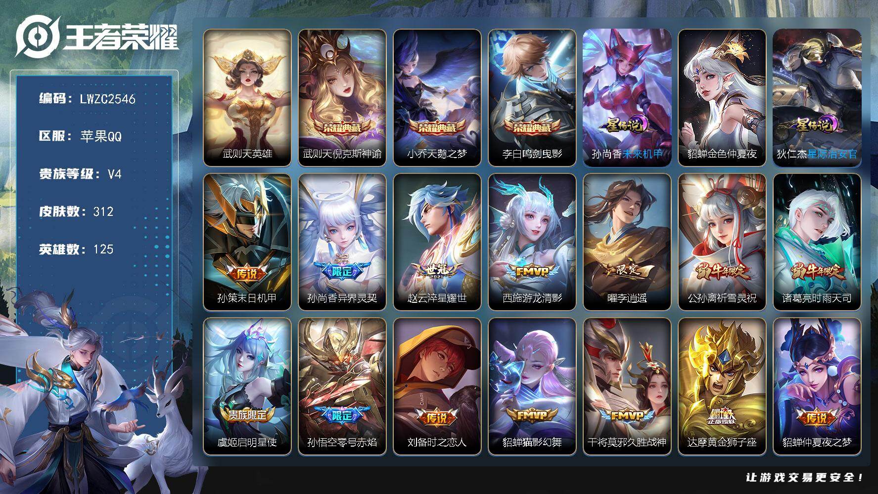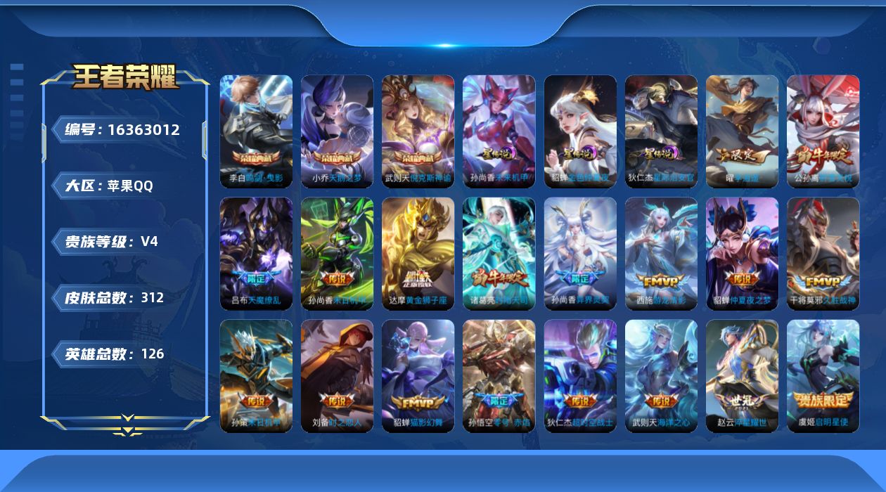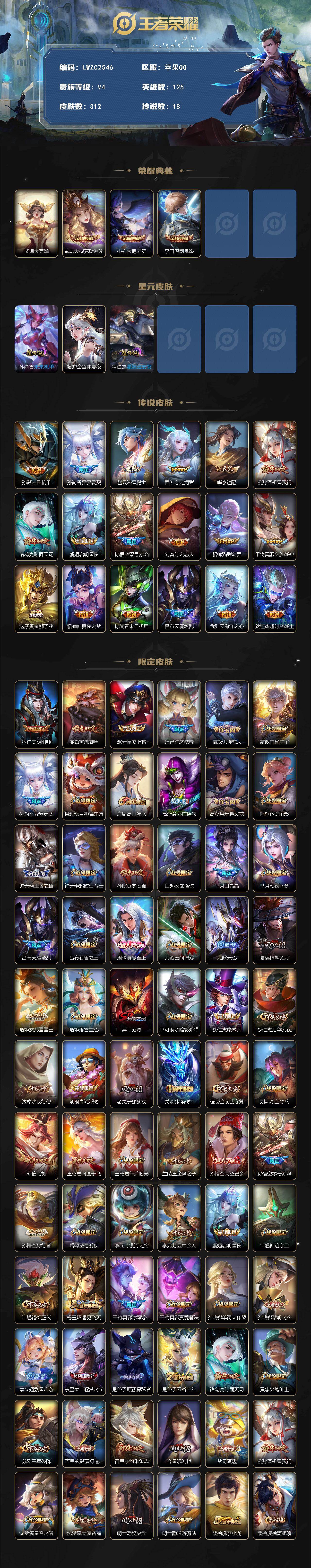[16363012]可二次【特价出售/店主推荐/3省标/7市标/38段发育路/3330星币】:苹果Q-V9-永恒钻石IV段位-125英雄-312皮肤-3典藏皮肤-1典藏英雄-3星元-18传说-101史诗