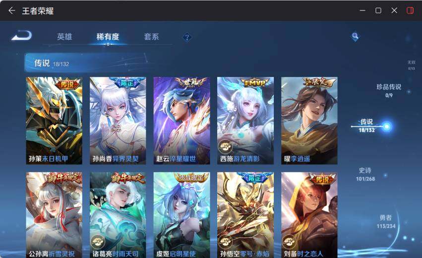 【传说皮肤】:孙策末日机甲,孙尚香异界灵契,赵云淬星耀世,西施游龙清影,曜李逍遥 ,公孙离祈雪灵祝,诸葛亮时雨天司,虞姬启明星使,孙悟空零号赤焰,刘备时之恋人,貂蝉猫影幻舞,干将莫邪久胜战神,达摩黄金狮子座,貂蝉仲夏夜之梦,孙尚香末日机甲,吕布天魔缭乱,武则天海洋之心,狄仁杰超时空战士