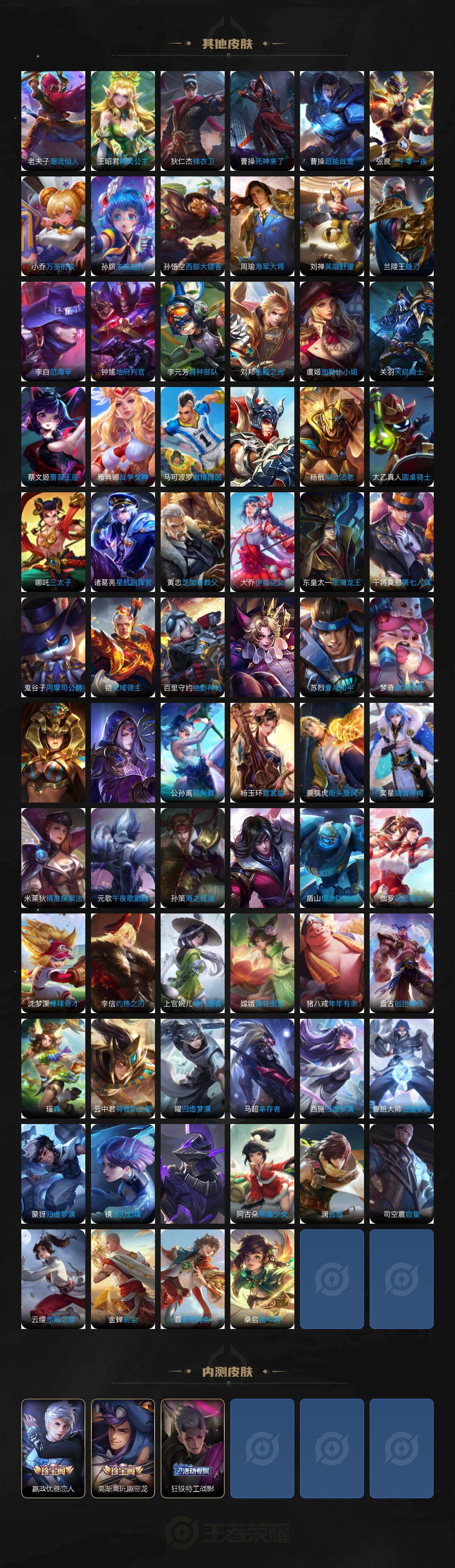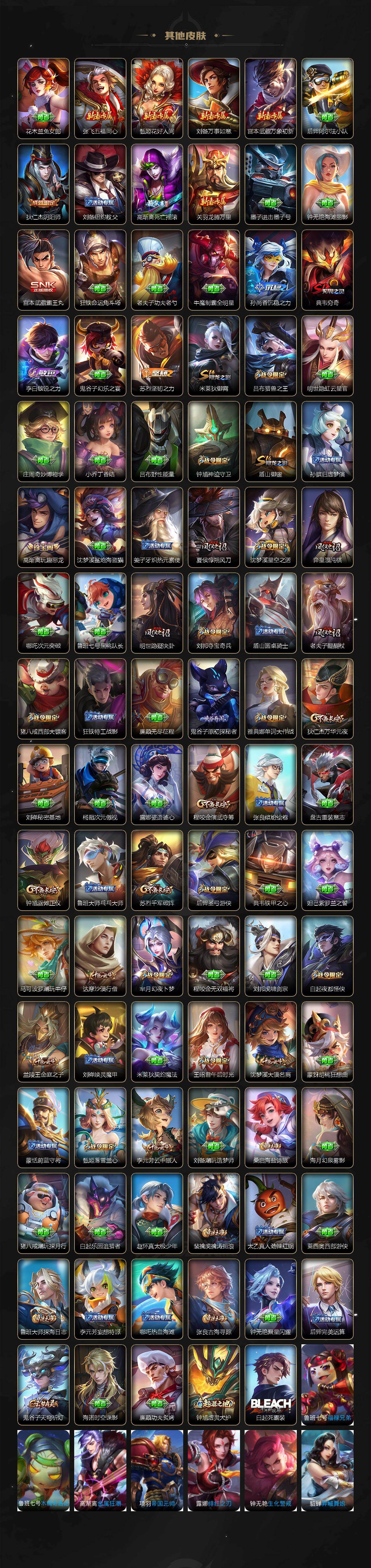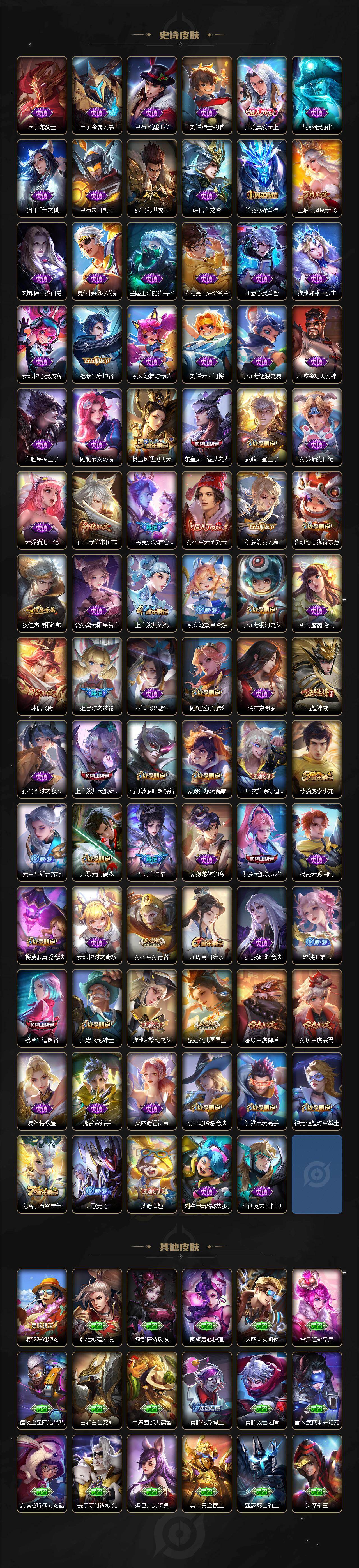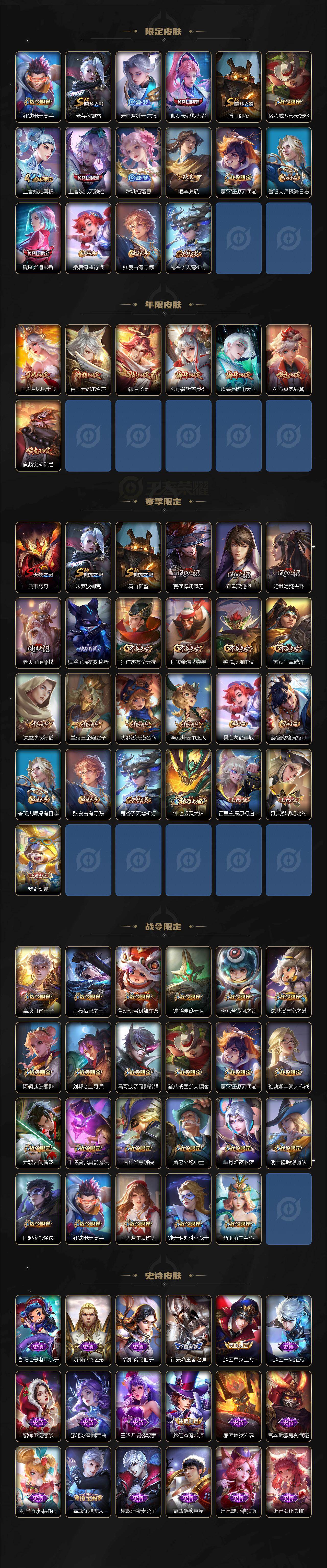 【限定皮肤】:狄仁杰阴阳师,廉颇寅虎御盾,赵云皇家上将,妲己时之彼端,嬴政优雅恋人,嬴政白昼王子,孙尚香异界灵契,鲁班七号狮舞东方,庄周高山流水,高渐离死亡摇滚,高渐离玩趣恶龙,阿轲迷踪丽影,钟无艳王者之锤,钟无艳超时空战士,孙膑寅虎展翼,白起夜都怪侠,芈月白晶晶,芈月幻夜卜梦,吕布天魔缭乱,吕布猎兽之王,周瑜真爱至上,元歌云间偶戏,元歌无心,夏侯惇朔风刀,甄姬女儿国国王,甄姬落雪兰心,典韦穷奇,马可波罗暗影游猎,狄仁杰魔术师,狄仁杰万华元夜,达摩沙漠行僧,项羽海滩派对,老夫子醍醐杖,关羽冰锋战神,程咬金演武夺筹,刘邦夺宝奇兵,韩信飞衡,王昭君凤凰于飞,王昭君午后时光,兰陵王金庭之子,孙悟空大圣娶亲,孙悟空零号赤焰,孙悟空孙行者,后羿圣弓游侠,李元芳银河之约,李元芳云中旅人,虞姬启明星使,钟馗神迹守卫,钟馗驱傩正仪,杨玉环遇见飞天,干将莫邪冰霜恋舞曲,干将莫邪真爱魔法,雅典娜单词大作战,雅典娜黎明之约,蔡文姬繁星吟游,东皇太一逐梦之光,鬼谷子原初探秘者,鬼谷子五谷丰年,诸葛亮时雨天司,黄忠火炮绅士,苏烈千军破阵,百里玄策原初追逐者,百里守约朱雀志,弈星混沌棋,梦奇顽趣,公孙离祈雪灵祝,沈梦溪星空之诺,沈梦溪大漠名商,明世隐疑决卦,明世隐吟游魔法,裴擒虎李小龙,裴擒虎擒涛扼浪,狂铁电玩高手,米莱狄御霄,云中君纤云弄巧,伽罗天狼溯光者,盾山御銮,猪八戒西部大镖客,上官婉儿梁祝,上官婉儿天狼绘梦者,嫦娥拒霜思,曜李逍遥 ,蒙犽狂想玩偶喵,鲁班大师探海日志,镜匿光追影者,桑启海盐诗旅,张良古海寻踪,鬼谷子天穹祈灯