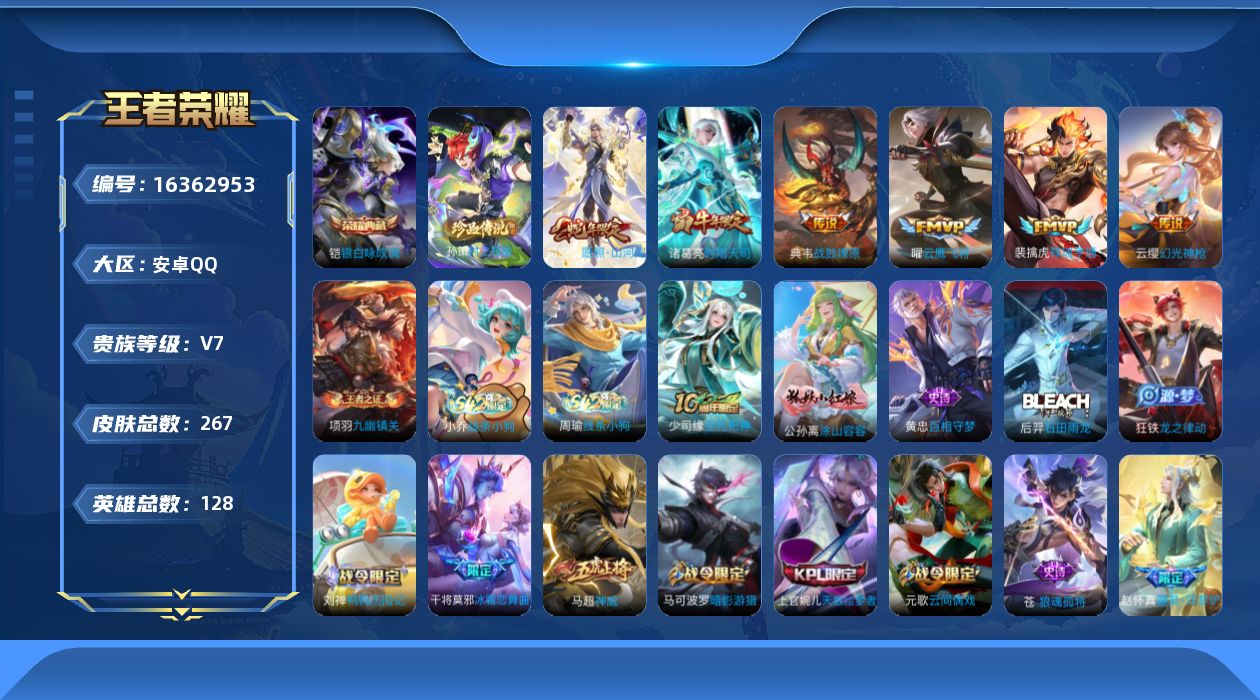 [16362953]【店主推荐捡漏号!可直接换绑】安卓Q-V7-至尊星耀V段位-128英雄-267皮肤-1典藏皮肤-1珍品传说-7传说-72史诗