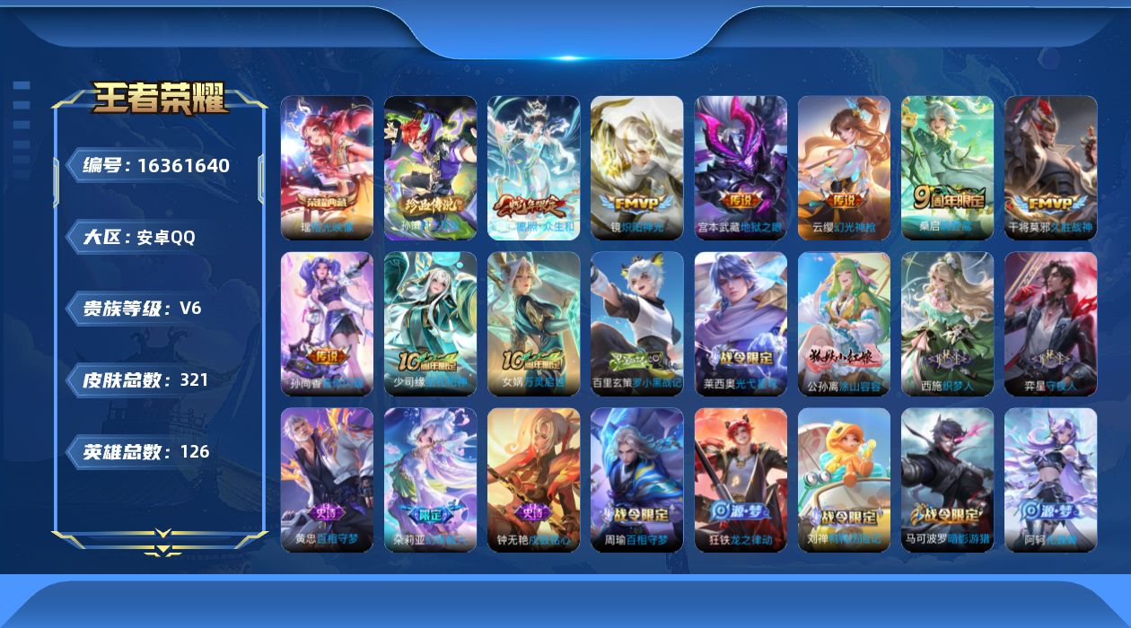 - [11677282]V9 3典藏 20传说 124英雄 273皮肤 典藏英雄武则天 可修改实名 女号 荣耀水晶:银白咏叹调(倪克斯侍卫),杀手不太冷,无限飓风号(高达) 传说皮:游龙清影(小青龙),山海·炽霜斩(李信年限),仲夏夜之梦(大飞蛾),地狱之眼,末日机甲-孙尚香(绿蚂蚱),云霓雀翎,猫影幻舞,胖达荣荣,挚爱之约,挚爱花嫁,炽翼辉光(娃娃菜牛角包) 珍宝阁皮:蔷薇恋人 限定皮:凤凰于飞,太华(伽罗年限),异界灵契(白毛香),前尘镜,时之彼端,白鹤梁神女,山海·碧波行(瑶年限),无限倾心-项羽,遇见飞天,高山流水,无限倾心-虞姬,匿光决锋者,怒海麟威,冰锋战神,梁祝,逐梦之星,天狼溯光者,李小龙,逐梦之影,朱雀志(守约年限),霸王别姬-项羽,霸王别姬-虞姬,真爱至上,孙行者,猪悟能,乒乒小将,蜜橘之夏,时之祈愿-瑶(瑶传限),枫霜尽,时之奇旅-妲己,山海·玄木吟(马可年限) 史诗皮:遇见神鹿,苍穹之光,电玩小子(小书包),特工魅影,冰冠公主,偶像歌手,无限星赏官,白蛇,暗夜猫娘,龙骑士(小龙虾),末日机甲-吕布,猫狗日记-孙策,时之恋人-孙尚香,乱世虎臣,节奏热浪,女仆咖啡,摇滚巨星,水果甜心,绅士熊喵,天才门将,星夜王子,功夫厨神,德古拉伯爵,暗隐猎兽者,幽灵船长,鬼剑武藏,心灵战警,舞动绿茵,繁星吟游(呼啦呼啦),拒霜思,缤纷独角兽,乘风破浪,逐浪之夏,龙鼓争鸣,水晶猎龙者,曙光守护者,箭羽风息,唤灵魅影,金属风暴,圣诞狂欢,圣诞恋歌,鹰眼统帅,王者之锤,暗夜贵公子,魅力维加斯,无心,未来纪元-赵云