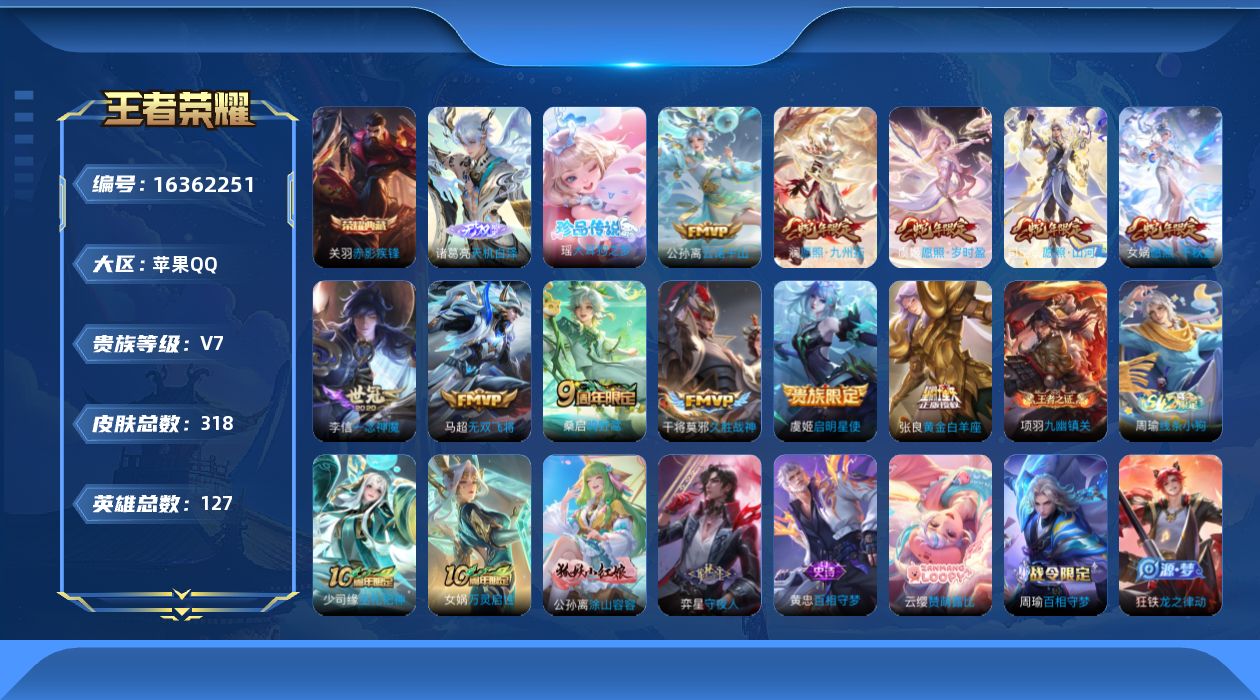[16362251]【特价出售/店主推荐】苹果Q-V7-至尊星耀IV段位-127英雄-318皮肤-1典藏皮肤-1无双-1珍品传说-1星传说-12传说-86史诗