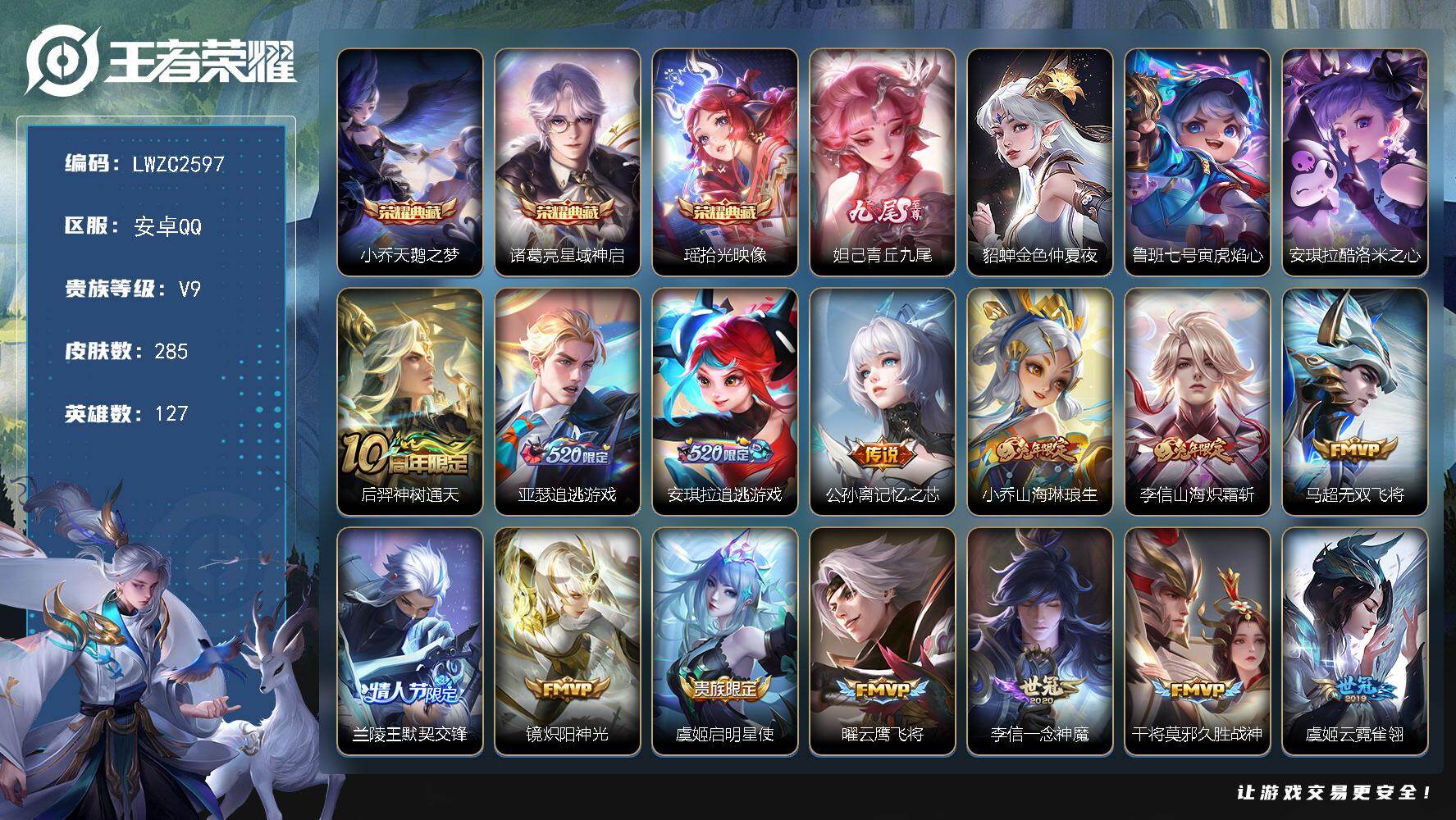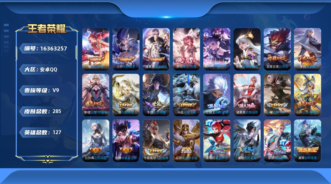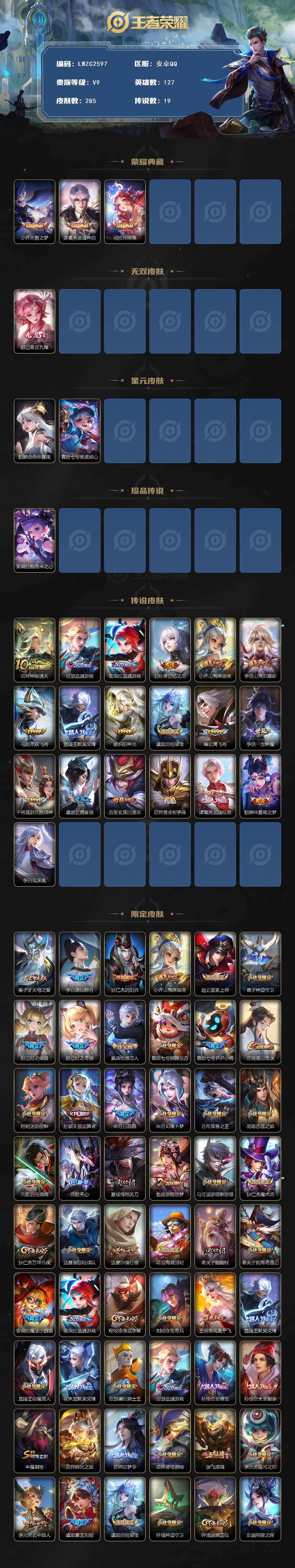 [16363257]【店主推荐捡漏号!可直接换绑】安卓Q-V9-至尊星耀IV段位-127英雄-285皮肤-3典藏皮肤-1无双-1珍品传说-19传说-87史诗-2星元
