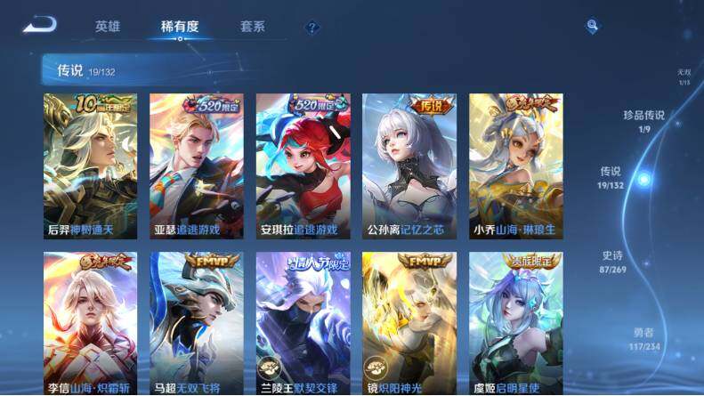【传说皮肤】:后羿神树通天,亚瑟追逃游戏,安琪拉追逃游戏,公孙离记忆之芯,小乔山海琳琅生,李信山海炽霜斩,马超无双飞将,兰陵王默契交锋,镜炽阳神光,虞姬启明星使,曜云鹰飞将,李信一念神魔,干将莫邪久胜战神,虞姬云霓雀翎,百里玄策白虎志,后羿黄金射手座,诸葛亮武陵仙君,貂蝉仲夏夜之梦,李白凤求凰