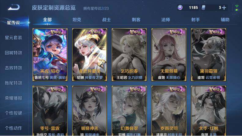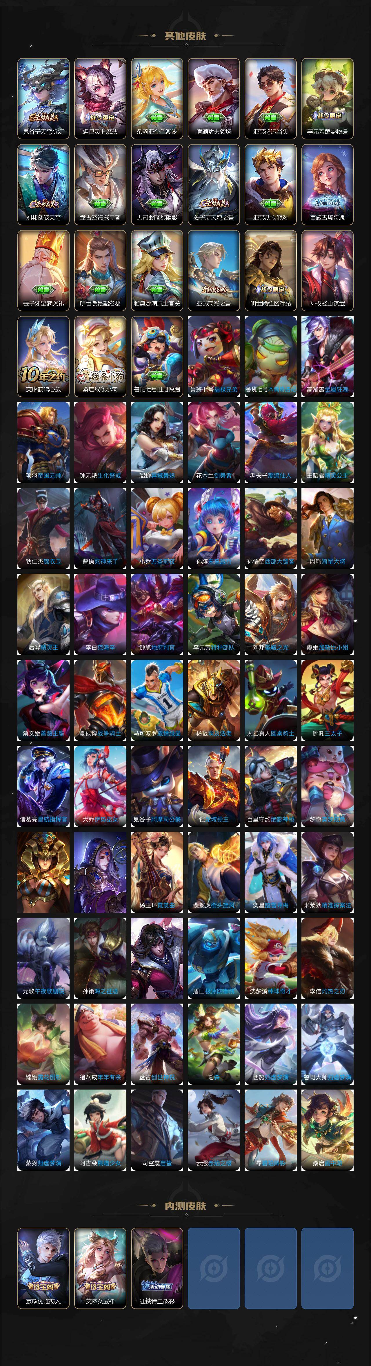 裴擒虎李小龙,上官婉儿梁祝,张飞虎魄,后羿辉光之辰,裴擒虎天狼狩猎者,孙膑天狼运算者,上官婉儿天狼绘梦者,伽罗天狼溯光者,东皇太一逐梦之光,铠青龙志,百里玄策白虎志,王昭君凤凰于飞,虞姬霸王别姬,孙悟空大圣娶亲,花木兰默契交锋,兰陵王默契交锋,后羿如梦令,嫦娥如梦令,孙悟空至尊宝,蔡文姬奇迹圣诞,妲己时之彼端,芈月白晶晶,安琪拉魔法小厨娘,鲁班七号乒乒小将,大乔白鹤梁神女,妲己时之奇旅,瑶山海·碧波行