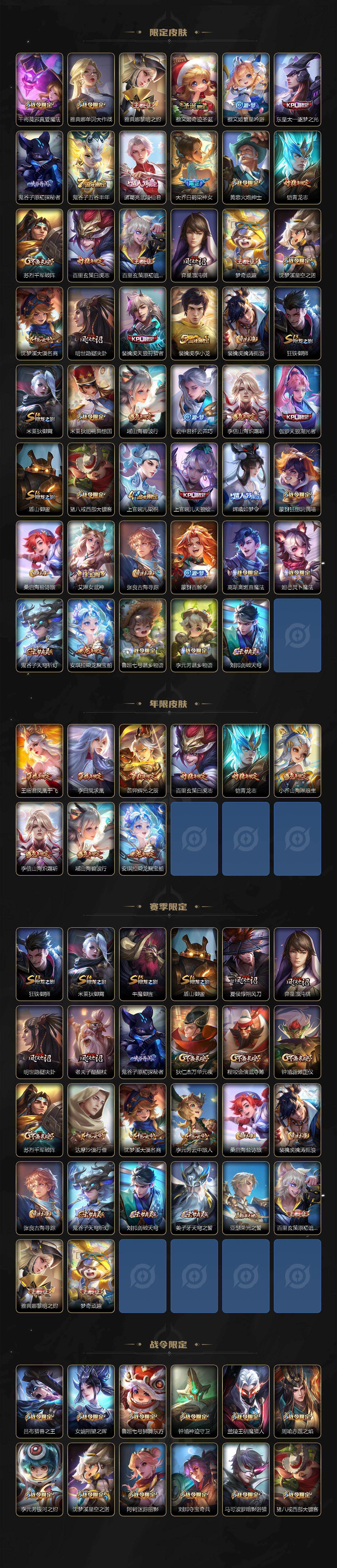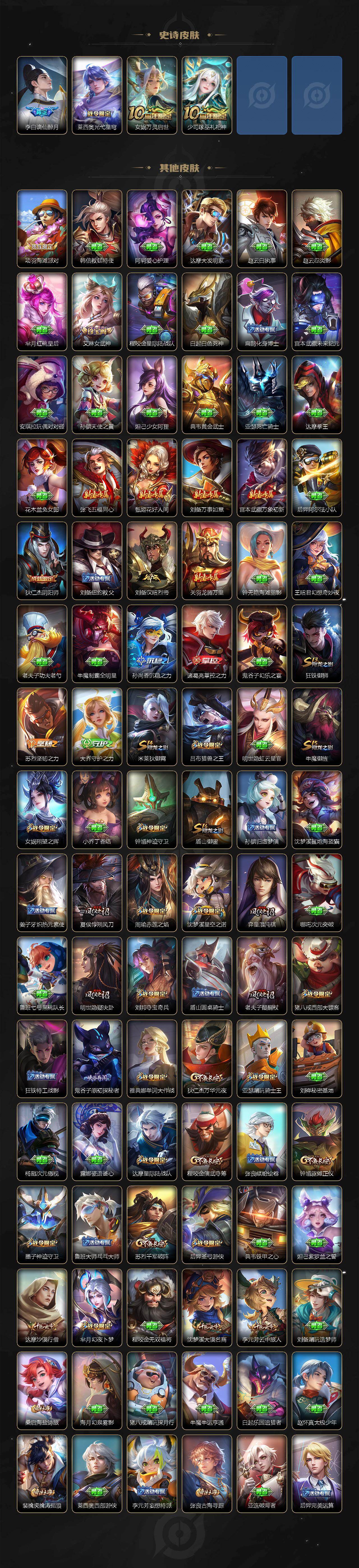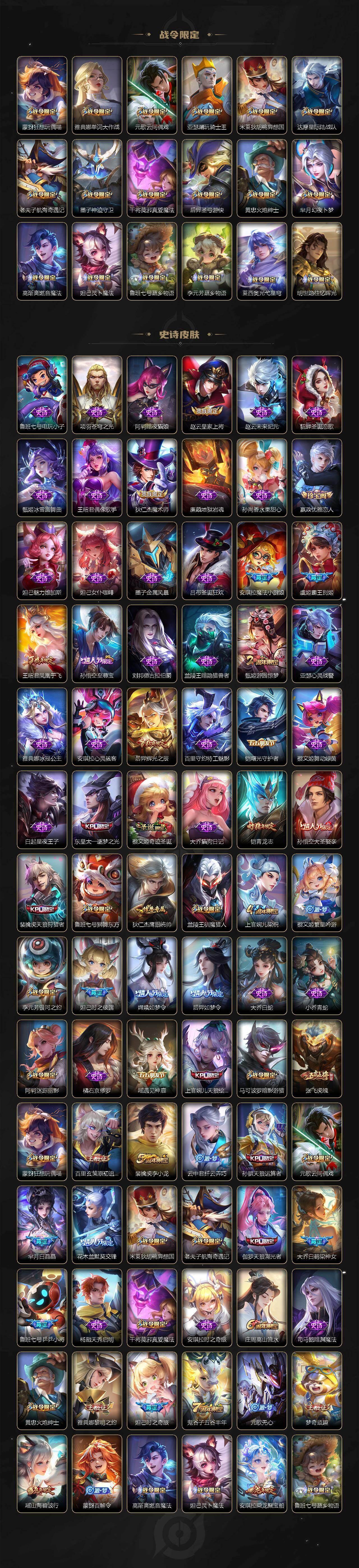 【限定皮肤】:姜子牙天穹之誓,李白谪仙醉月,狄仁杰阴阳师,小乔山海琳琅生,赵云皇家上将,墨子神迹守卫,妲己时之彼端,妲己时之奇旅,嬴政优雅恋人,鲁班七号狮舞东方,鲁班七号乒乒小将,庄周高山流水,阿轲迷踪丽影,孙膑天狼运算者,芈月白晶晶,芈月幻夜卜梦,吕布猎兽之王,周瑜赤莲之焰,元歌云间偶戏,元歌无心,夏侯惇朔风刀,甄姬游园惊梦,马可波罗暗影游猎,狄仁杰魔术师,狄仁杰万华元夜,达摩星际陆战队,达摩沙漠行僧,项羽海滩派对,老夫子醍醐杖,老夫子航海奇遇记,安琪拉魔法小厨娘,安琪拉追逃游戏,程咬金演武夺筹,刘邦夺宝奇兵,王昭君凤凰于飞,兰陵王默契交锋,兰陵王驯魔猎人,花木兰默契交锋,亚瑟潮玩骑士王,亚瑟追逃游戏,孙悟空至尊宝,孙悟空大圣娶亲,牛魔御旌,后羿辉光之辰,后羿如梦令,后羿圣弓游侠,张飞虎魄,李元芳银河之约,李元芳云中旅人,虞姬霸王别姬,虞姬启明星使,钟馗神迹守卫,钟馗驱傩正仪,女娲朔望之晖,干将莫邪真爱魔法,雅典娜单词大作战,雅典娜黎明之约,蔡文姬奇迹圣诞,蔡文姬繁星吟游,东皇太一逐梦之光,鬼谷子原初探秘者,鬼谷子五谷丰年,诸葛亮武陵仙君,大乔白鹤梁神女,黄忠火炮绅士,铠青龙志,苏烈千军破阵,百里玄策白虎志,百里玄策原初追逐者,弈星混沌棋,梦奇顽趣,沈梦溪星空之诺,沈梦溪大漠名商,明世隐疑决卦,裴擒虎天狼狩猎者,裴擒虎李小龙,裴擒虎擒涛扼浪,狂铁御狮,米莱狄御霄,米莱狄胡桃异想国,瑶山海碧波行,云中君纤云弄巧,李信山海炽霜斩,伽罗天狼溯光者,盾山御銮,猪八戒西部大镖客,上官婉儿梁祝,上官婉儿天狼绘梦者,嫦娥如梦令,蒙犽狂想玩偶喵,桑启海盐诗旅,艾琳女武神,张良古海寻踪,蒙犽百解令,