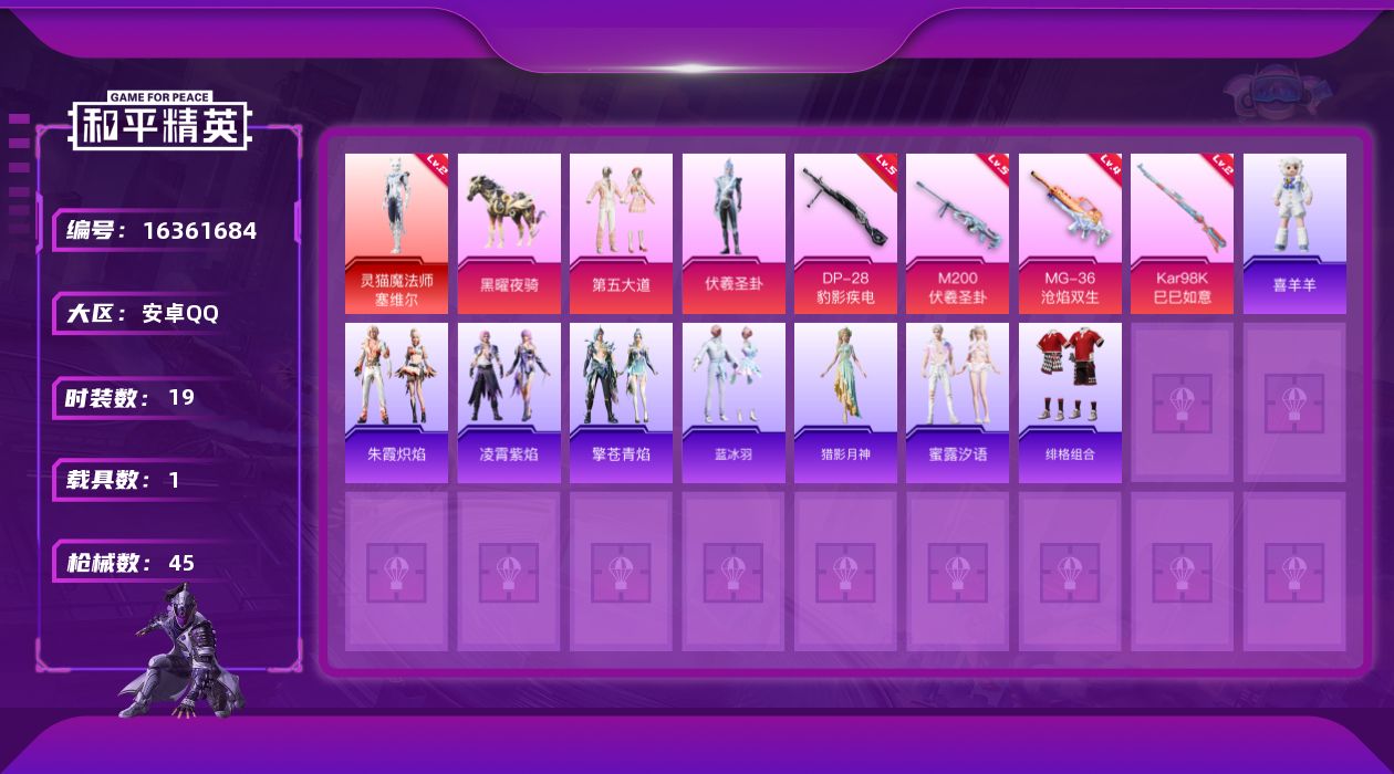 [16361684]【特价出售/店主推荐】安卓 手Q-1神装-2粉装-4特效枪-1载具-2粉色飞行器-15225热力值-1王牌印记-19套装-45枪皮