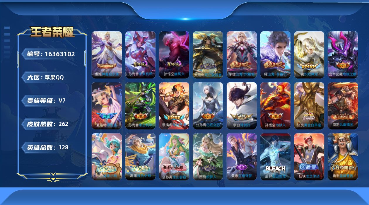 [16363102]可二次【特价出售/店主推荐】苹果Q-V7-最强王者段位-128英雄-262皮肤-1典藏皮肤-2星传说-13传说-72史诗
