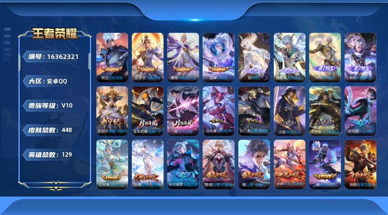 [16362321]【店主推荐捡漏号!可直接换绑】安卓Q-V10-最强王者段位-129英雄-448皮肤-4典藏皮肤-1典藏英雄-5无双-2珍品传说-50传说-139史诗-3星元