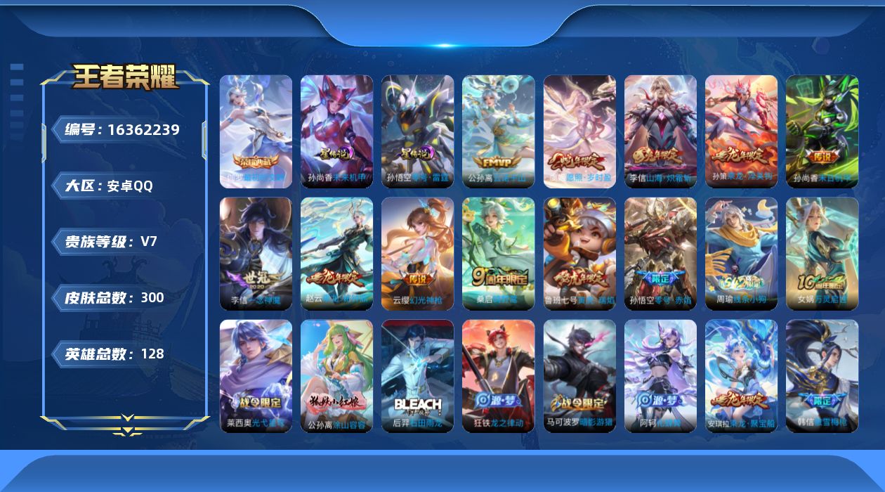 [16362239]【特价出售/店主推荐/4市标/43段发育/314段打野/】:安卓Q-V7-永恒钻石I段位-128英雄-300皮肤-1典藏皮肤-3星元-12传说-81史诗