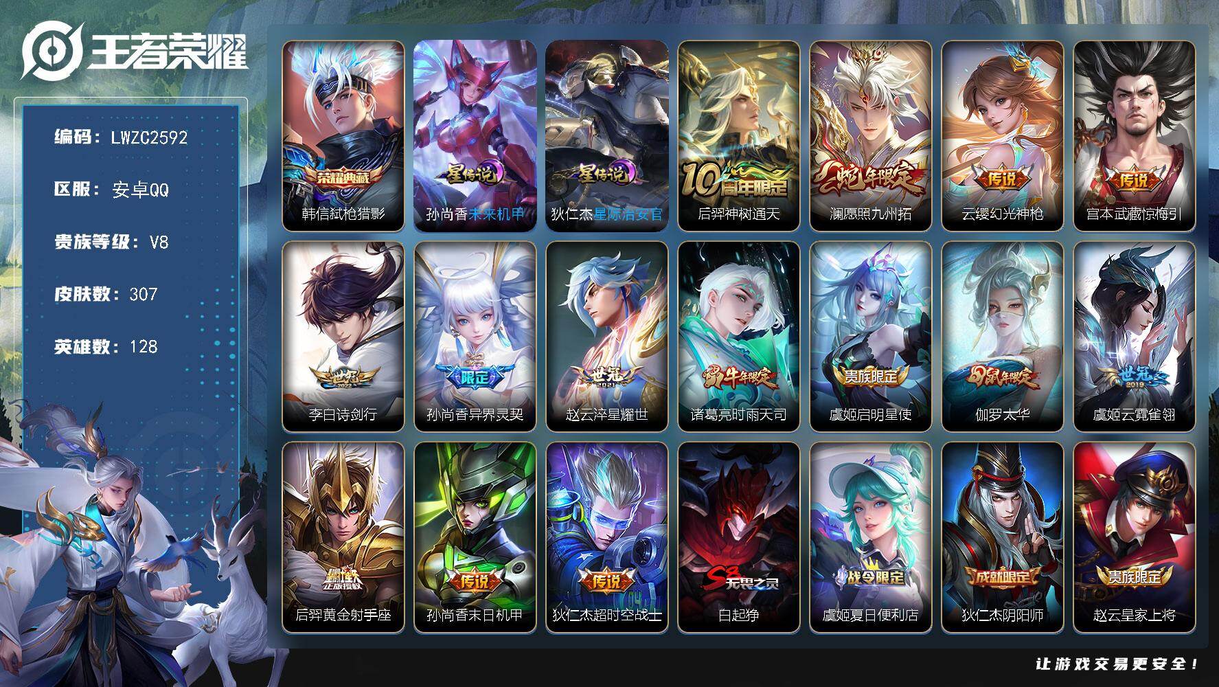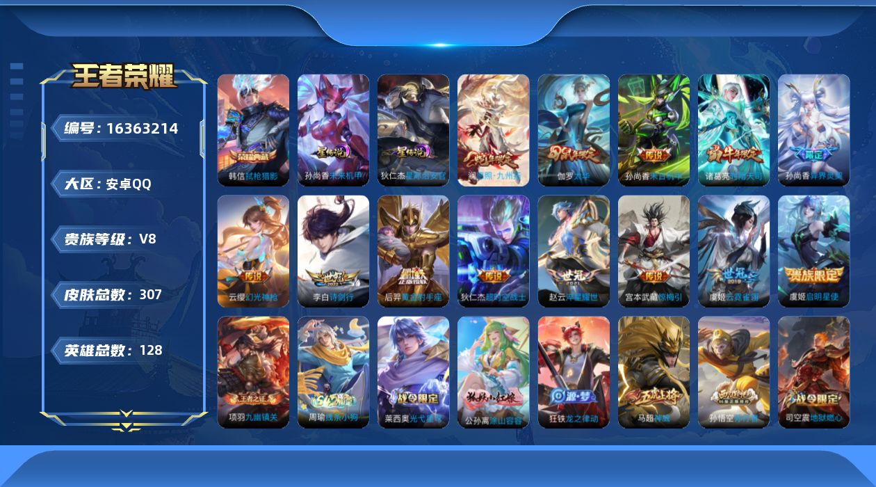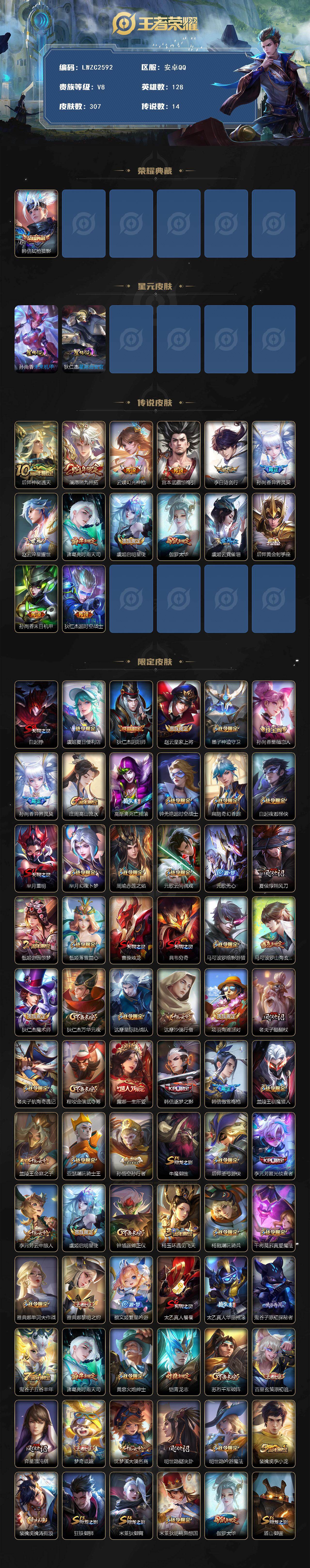 [16363214]【店主推荐捡漏号!可直接换绑】安卓Q-V8-至尊星耀II段位35段发育路-128英雄-307皮肤-1典藏皮肤-14传说-88史诗-2星元