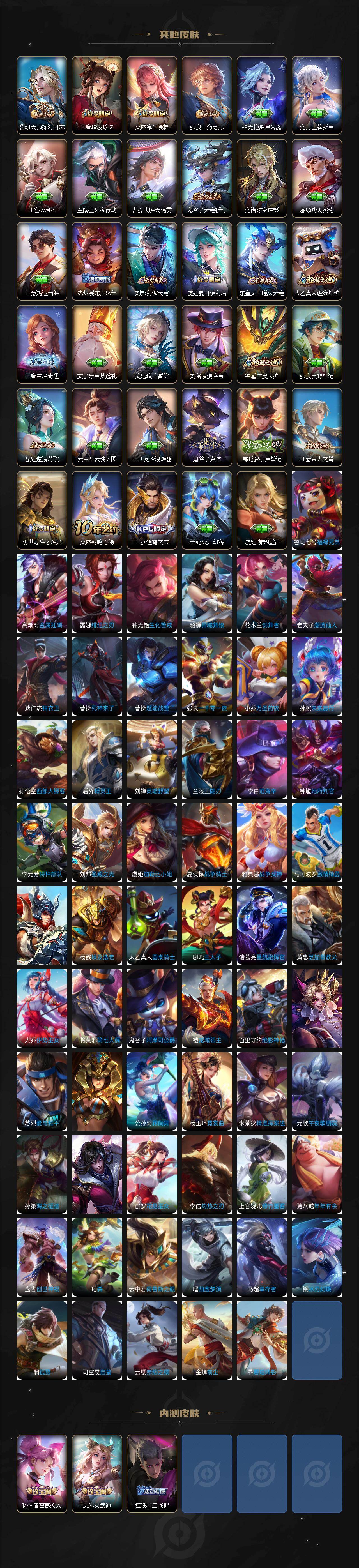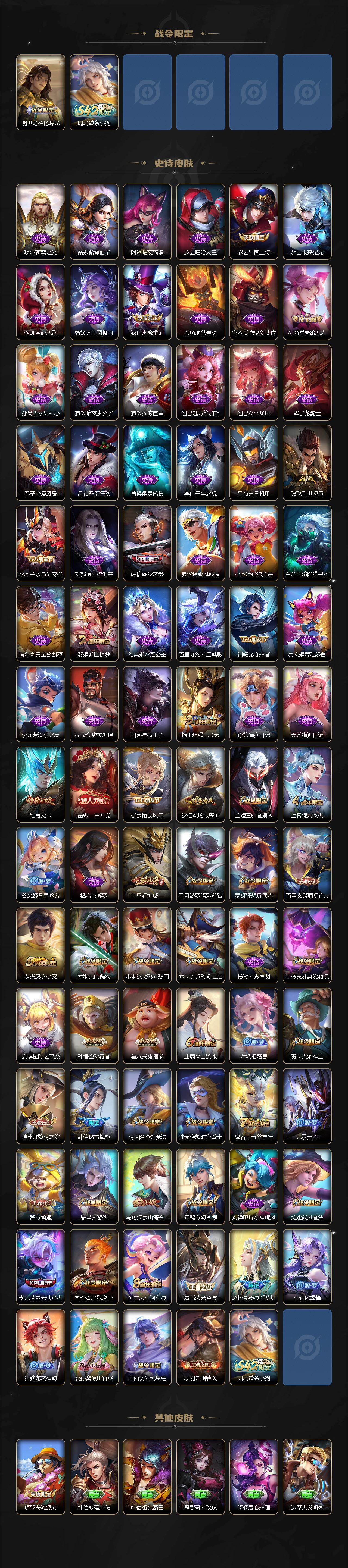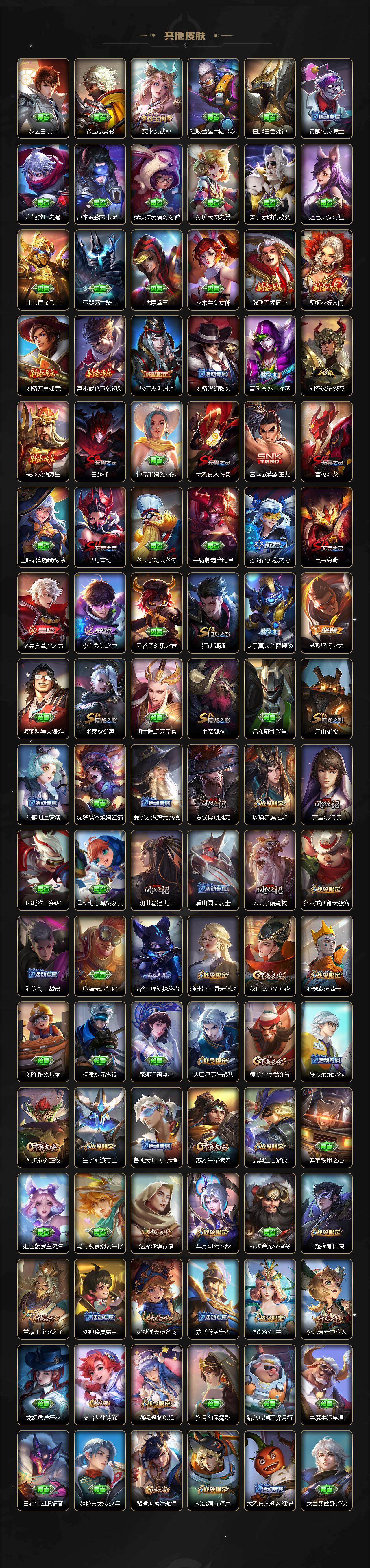 【限定皮肤】:白起狰,虞姬夏日便利店,狄仁杰阴阳师,赵云皇家上将,墨子神迹守卫,孙尚香蔷薇恋人,孙尚香异界灵契,庄周高山流水,高渐离死亡摇滚,钟无艳超时空战士,扁鹊奇幻香踪,白起夜都怪侠,芈月重明,芈月幻夜卜梦,周瑜赤莲之焰,元歌云间偶戏,元歌无心,夏侯惇朔风刀,甄姬游园惊梦,甄姬落雪兰心,曹操烛龙,典韦穷奇,马可波罗暗影游猎,马可波罗山海玄木吟,狄仁杰魔术师,狄仁杰万华元夜,达摩星际陆战队,达摩沙漠行僧,项羽海滩派对,老夫子醍醐杖,老夫子航海奇遇记,程咬金演武夺筹,露娜一生所爱,韩信逐梦之影,韩信傲雪梅枪,兰陵王驯魔猎人,兰陵王金庭之子,亚瑟潮玩骑士王,孙悟空孙行者,牛魔御旌,后羿圣弓游侠,李元芳匿光侦查者,李元芳云中旅人,虞姬启明星使,钟馗驱傩正仪,杨玉环遇见飞天,杨戬潮玩骑兵,干将莫邪真爱魔法,雅典娜单词大作战,雅典娜黎明之约,蔡文姬繁星吟游,太乙真人饕餮,太乙真人华丽摇滚,鬼谷子原初探秘者,鬼谷子五谷丰年,诸葛亮时雨天司,黄忠火炮绅士,铠青龙志,苏烈千军破阵,百里玄策原初追逐者,弈星混沌棋,梦奇顽趣,沈梦溪大漠名商,明世隐疑决卦,明世隐吟游魔法,裴擒虎李小龙,裴擒虎擒涛扼浪,狂铁御狮,米莱狄御霄,米莱狄胡桃异想国,伽罗太华,盾山御銮,猪八戒西部大镖客,猪八戒猪悟能,上官婉儿梁祝,嫦娥拒霜思,嫦娥暖冬兔眠,西施玲珑珍味,蒙犽狂想玩偶喵,鲁班大师探海日志,桑启海盐诗旅,暃星界游侠,戈娅驭风魔法,艾琳女武神,艾琳流音漫舞,司空震地狱燃心,阿古朵江河有灵,张良古海寻踪,蒙恬荣光圣徽,鬼谷子天穹祈灯,沈梦溪龙舞盛年,刘邦剑破天穹