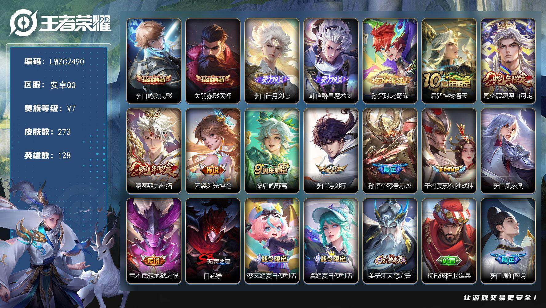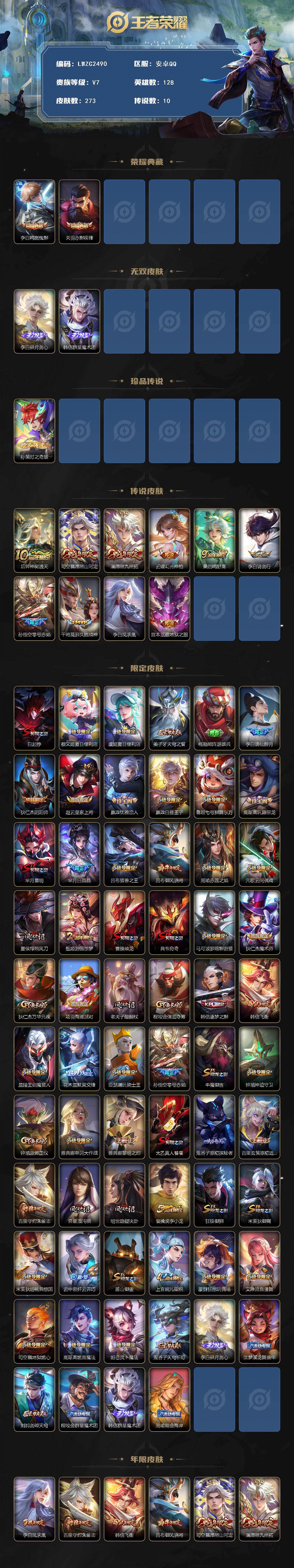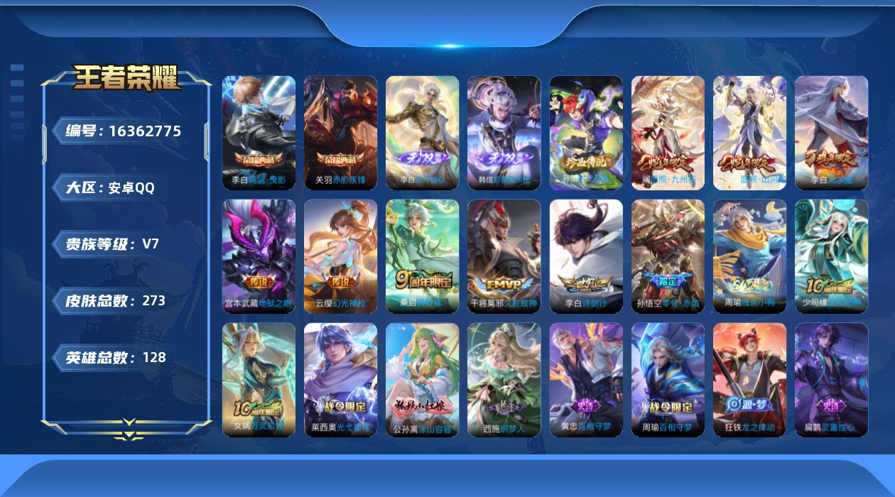 [16362775]【店主推荐捡漏号!可直接换绑】连体火影10S 安卓Q-V7-至尊星耀III段位-128英雄-273皮肤-2典藏皮肤-2无双-1珍品传说-10传说-80史诗 【英雄全皮】:李白全皮,孙权全皮,司空震全皮,影全皮 【荣耀典藏】:李白鸣剑曳影,关羽赤影疾锋 【无双皮肤】:李白碎月剑心,韩信群星魔术团 【珍品传说】:孙策时之奇旅 【传说皮肤】:后羿神树通天,司空震愿照山河定,澜愿照九州拓,云缨幻光神枪,桑启鸣野蒿,李白诗剑行,孙悟空零号赤焰,干将莫邪久胜战神,李白凤求凰,宫本武藏地狱之眼 【限定皮肤】:白起狰,蔡文姬夏日便利店,虞姬夏日便利店,姜子牙天穹之誓,杨戬破阵退雄兵,李白谪仙醉月,狄仁杰阴阳师,赵云皇家上将,嬴政优雅恋人,嬴政白昼王子,鲁班七号狮舞东方,高渐离玩趣恶龙,芈月重明,芈月白晶晶,吕布猎兽之王,吕布御风骁将,周瑜赤莲之焰,元歌云间偶戏,夏侯惇朔风刀,甄姬游园惊梦,曹操烛龙,典韦穷奇,马可波罗暗影游猎,狄仁杰魔术师,狄仁杰万华元夜,项羽海滩派对,老夫子醍醐杖,程咬金演武夺筹,韩信逐梦之影,韩信飞衡,兰陵王驯魔猎人,花木兰默契交锋,亚瑟潮玩骑士王,孙悟空零号赤焰,牛魔御旌,钟馗神迹守卫,钟馗驱傩正仪,雅典娜单词大作战,雅典娜黎明之约,太乙真人饕餮,鬼谷子原初探秘者,百里玄策原初追逐者,百里守约朱雀志,弈星混沌棋,明世隐疑决卦,裴擒虎李小龙,狂铁御狮,米莱狄御霄,米莱狄胡桃异想国,云中君纤云弄巧,盾山御銮,上官婉儿梁祝,蒙犽狂想玩偶喵,艾琳流音漫舞,司空震地狱燃心,高渐离燃音魔法,妲己灵卜魔法,鬼谷子天穹祈灯,李白碎月剑心,沈梦溪龙舞盛年,刘邦剑破天穹,程咬金群星魔术团,韩信群星魔术团,周瑜熔金海岸 【年限皮肤】:李白凤求凰,百里守约朱雀志,韩信飞衡,吕布御风骁将,司空震愿照山河定,澜愿照九州拓 【赛季限定】:白起狰,太乙真人饕餮,曹操烛龙,芈月重明,典韦穷奇,狂铁御狮,米莱狄御霄,牛魔御旌,盾山御銮,夏侯惇朔风刀,弈星混沌棋,明世隐疑决卦,老夫子醍醐杖,鬼谷子原初探秘者,狄仁杰万华元夜,程咬金演武夺筹,钟馗驱傩正仪,鬼谷子天穹祈灯,刘邦剑破天穹,姜子牙天穹之誓,东皇太一噬灭天穹,太乙真人谧流熔炉,钟馗虚灵犬护,甄姬逆浪荇歌,亚瑟荣光之誓,百里玄策原初追逐者,雅典娜黎明之约,牛魔星界战将 【战令限定】:嬴政白昼王子,吕布猎兽之王,鲁班七号狮舞东方,钟馗神迹守卫