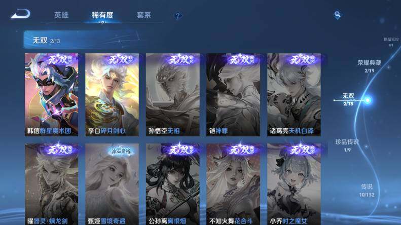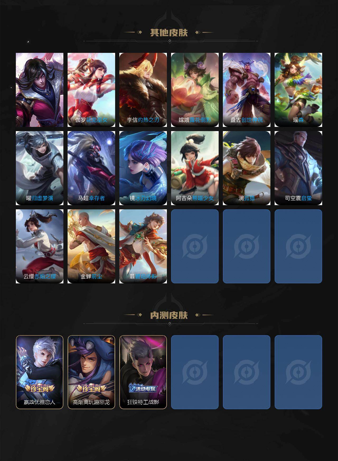 裴擒虎李小龙,上官婉儿梁祝,吕布御风骁将,马超神威,韩信飞衡,韩信逐梦之影,百里守约朱雀志,花木兰默契交锋,芈月白晶晶,李白诗剑行,桑启鸣野蒿,澜愿照·九州拓,司空震愿照·山河定