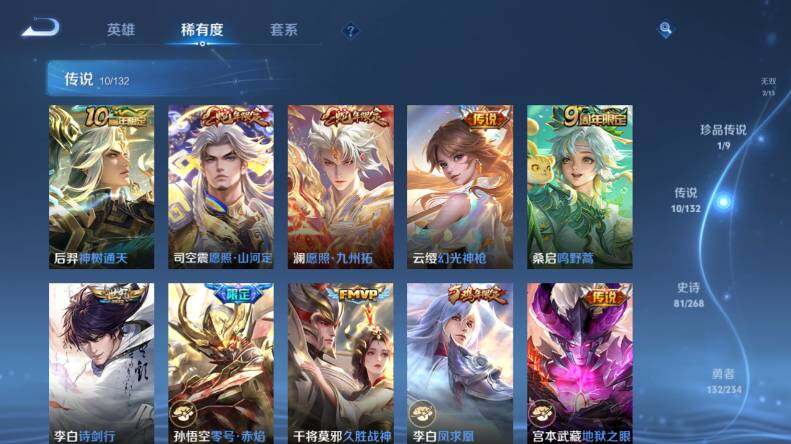 【传说皮肤】:后羿神树通天,司空震愿照山河定,澜愿照九州拓,云缨幻光神枪,桑启鸣野蒿,李白诗剑行,孙悟空零号赤焰,干将莫邪久胜战神,李白凤求凰,宫本武藏地狱之眼
