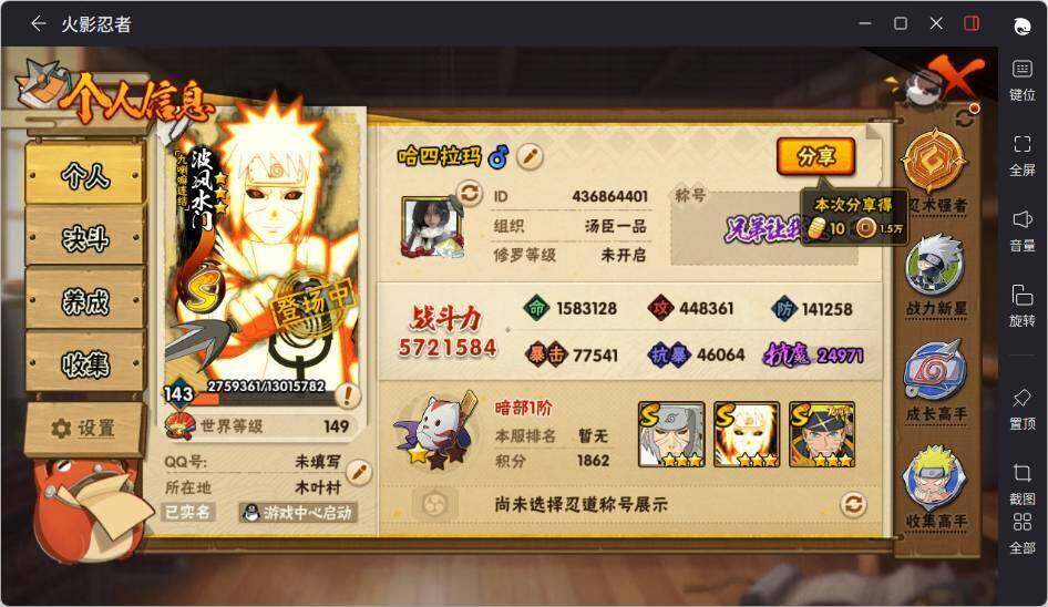 [16362775]【店主推荐捡漏号!可直接换绑】连体火影10S 安卓Q-V7-至尊星耀III段位-128英雄-273皮肤-2典藏皮肤-2无双-1珍品传说-10传说-80史诗