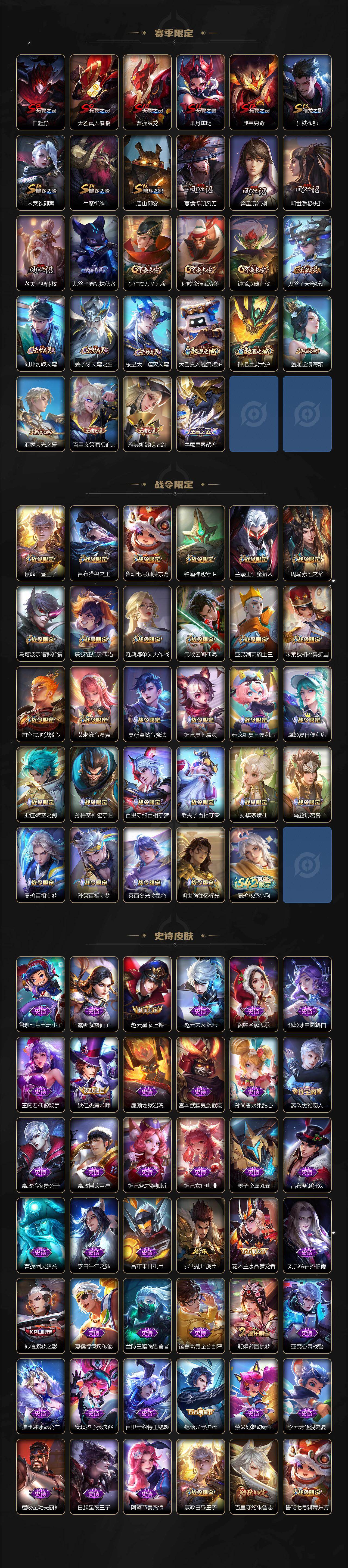 【赛季限定】:白起狰,太乙真人饕餮,曹操烛龙,芈月重明,典韦穷奇,狂铁御狮,米莱狄御霄,牛魔御旌,盾山御銮,夏侯惇朔风刀,弈星混沌棋,明世隐疑决卦,老夫子醍醐杖,鬼谷子原初探秘者,狄仁杰万华元夜,程咬金演武夺筹,钟馗驱傩正仪,鬼谷子天穹祈灯,刘邦剑破天穹,姜子牙天穹之誓,东皇太一噬灭天穹,太乙真人谧流熔炉,钟馗虚灵犬护,甄姬逆浪荇歌,亚瑟荣光之誓,百里玄策原初追逐者,雅典娜黎明之约,牛魔星界战将