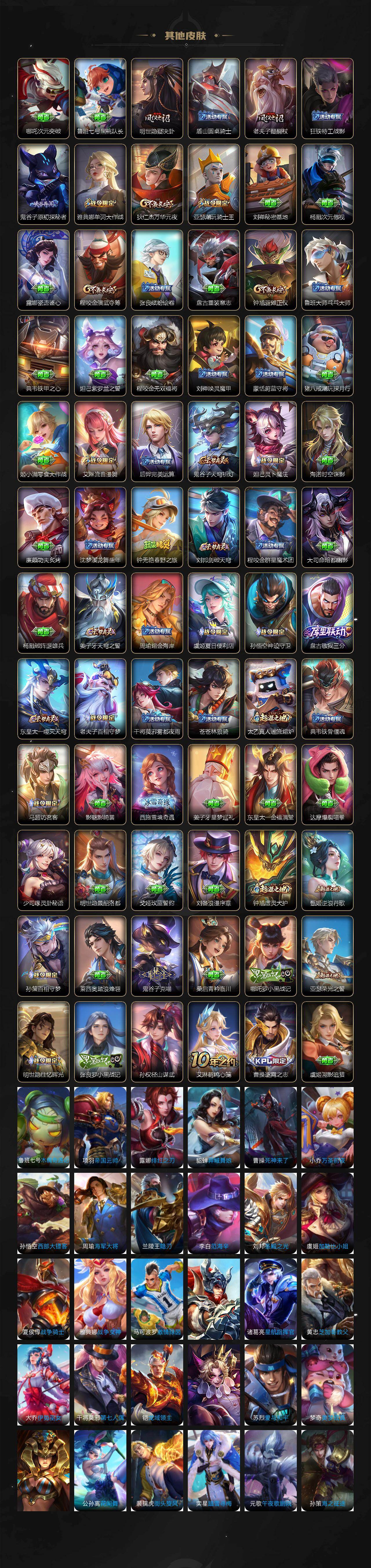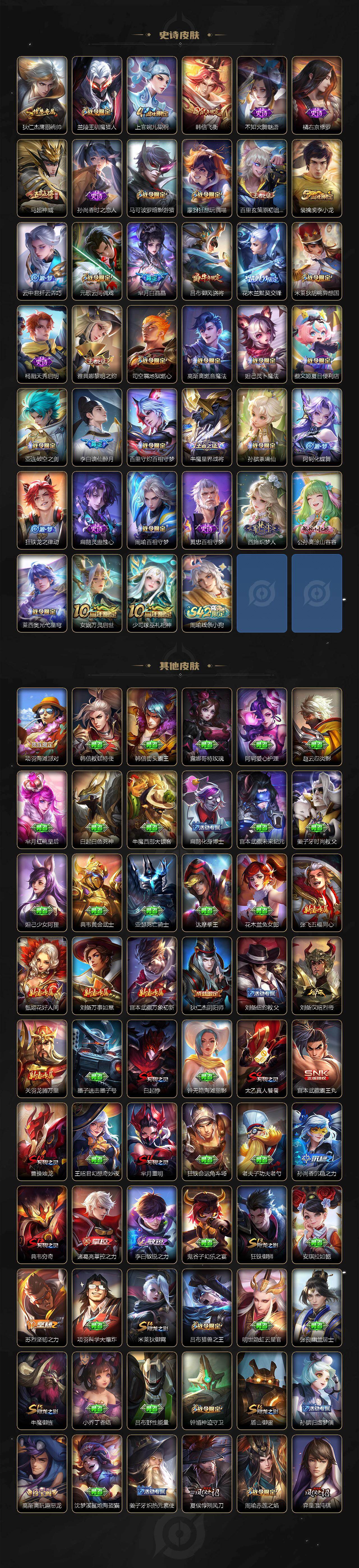 【限定皮肤】:白起狰,蔡文姬夏日便利店,虞姬夏日便利店,姜子牙天穹之誓,杨戬破阵退雄兵,李白谪仙醉月,狄仁杰阴阳师,赵云皇家上将,嬴政优雅恋人,嬴政白昼王子,鲁班七号狮舞东方,高渐离玩趣恶龙,芈月重明,芈月白晶晶,吕布猎兽之王,吕布御风骁将,周瑜赤莲之焰,元歌云间偶戏,夏侯惇朔风刀,甄姬游园惊梦,曹操烛龙,典韦穷奇,马可波罗暗影游猎,狄仁杰魔术师,狄仁杰万华元夜,项羽海滩派对,老夫子醍醐杖,程咬金演武夺筹,韩信逐梦之影,韩信飞衡,兰陵王驯魔猎人,花木兰默契交锋,亚瑟潮玩骑士王,孙悟空零号赤焰,牛魔御旌,钟馗神迹守卫,钟馗驱傩正仪,雅典娜单词大作战,雅典娜黎明之约,太乙真人饕餮,鬼谷子原初探秘者,百里玄策原初追逐者,百里守约朱雀志,弈星混沌棋,明世隐疑决卦,裴擒虎李小龙,狂铁御狮,米莱狄御霄,米莱狄胡桃异想国,云中君纤云弄巧,盾山御銮,上官婉儿梁祝,蒙犽狂想玩偶喵,艾琳流音漫舞,司空震地狱燃心,高渐离燃音魔法,妲己灵卜魔法,鬼谷子天穹祈灯,李白碎月剑心,沈梦溪龙舞盛年,刘邦剑破天穹,程咬金群星魔术团,韩信群星魔术团,周瑜熔金海岸