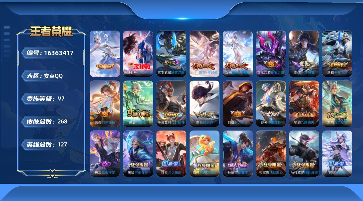 [16363417]【特价急出/详情看图】安卓Q-V7-永恒钻石II段位-127英雄-268皮肤-1典藏皮肤-1珍品传说-1星元-12传说-74史诗