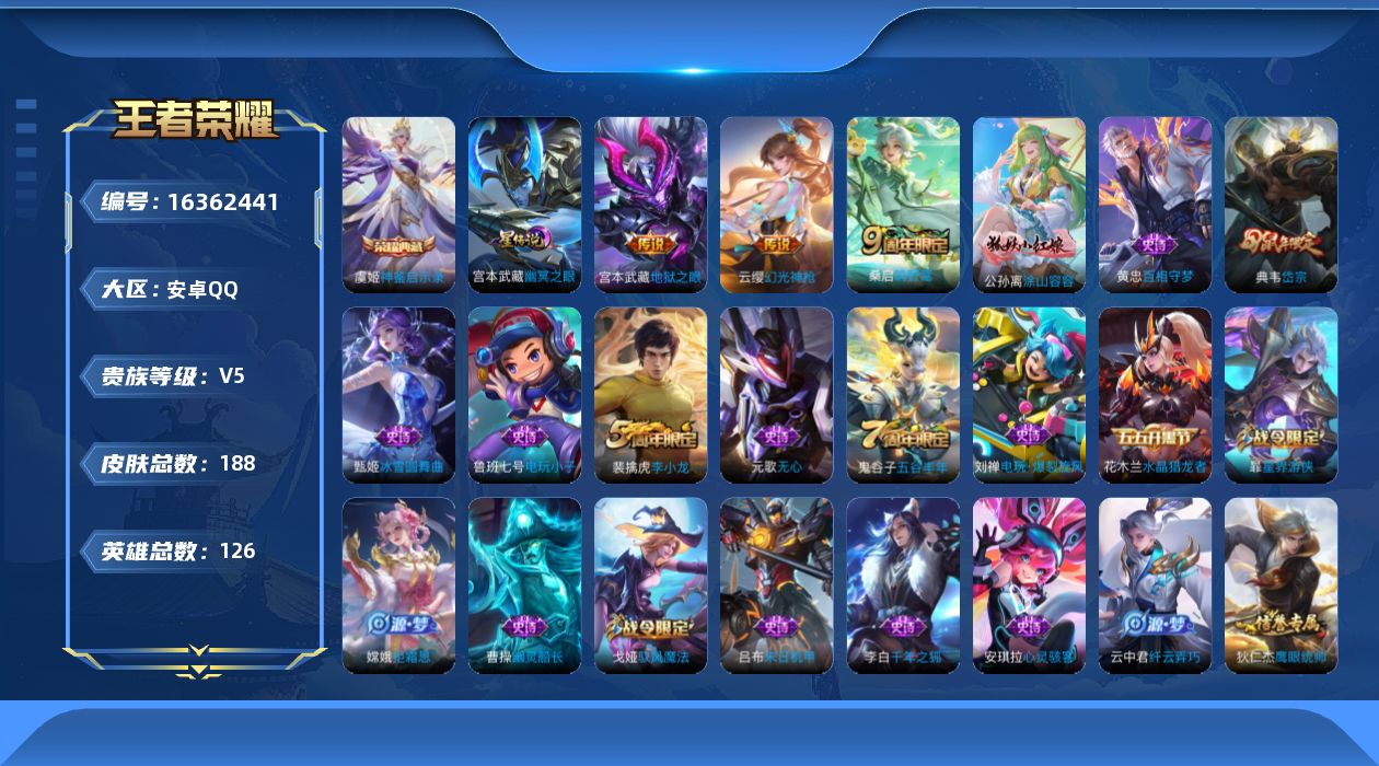 [16362441]【特价出售/店主推荐/1市标】:安卓Q-V5-永恒钻石V段位-126英雄-188皮肤-1典藏皮肤-1星元-4传说-47史诗