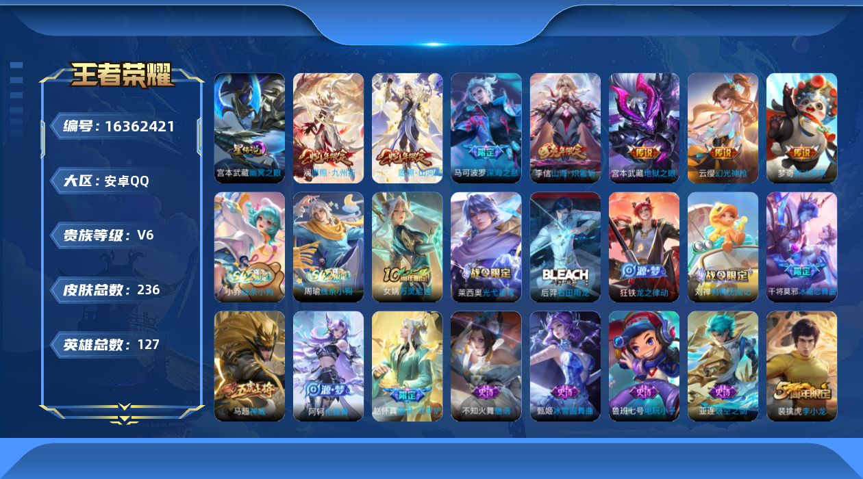 [16362421]【店主推荐捡漏号!可直接换绑】安卓Q-V6-至尊星耀III段位-127英雄-236皮肤-7传说-56史诗-1星元 【英雄全皮】:影全皮 【传说皮肤】:司空震愿照山河定,澜愿照九州拓,云缨幻光神枪,李信山海炽霜斩,马可波罗深海之息,梦奇胖达荣荣,宫本武藏地狱之眼 【限定皮肤】:姜子牙天穹之誓,杨戬破阵退雄兵,狄仁杰阴阳师,赵云皇家上将,嬴政优雅恋人,庄周高山流水,高渐离玩趣恶龙,元歌无心,夏侯惇朔风刀,马可波罗深海之息,狄仁杰魔术师,狄仁杰万华元夜,达摩星际陆战队,达摩沙漠行僧,项羽海滩派对,老夫子醍醐杖,程咬金演武夺筹,兰陵王金庭之子,牛魔御旌,后羿如梦令,李元芳云中旅人,钟馗驱傩正仪,干将莫邪冰霜恋舞曲,太乙真人华丽摇滚,鬼谷子原初探秘者,鬼谷子五谷丰年,苏烈千军破阵,弈星混沌棋,梦奇顽趣,沈梦溪大漠名商,明世隐疑决卦,裴擒虎李小龙,裴擒虎擒涛扼浪,米莱狄御霄,云中君纤云弄巧,李信山海炽霜斩,蒙犽狂想玩偶喵,鲁班大师探海日志,桑启海盐诗旅,艾琳女武神,阿古朵江河有灵,张良古海寻踪,蒙恬荣光圣徽,鬼谷子天穹祈灯,沈梦溪龙舞盛年,刘邦剑破天穹,程咬金群星魔术团,周瑜熔金海岸 【年限皮肤】:李信山海炽霜斩,司空震愿照山河定,澜愿照九州拓 【赛季限定】:米莱狄御霄,牛魔御旌,夏侯惇朔风刀,弈星混沌棋,明世隐疑决卦,老夫子醍醐杖,鬼谷子原初探秘者,狄仁杰万华元夜,程咬金演武夺筹,钟馗驱傩正仪,苏烈千军破阵,达摩沙漠行僧,兰陵王金庭之子,沈梦溪大漠名商,李元芳云中旅人,桑启海盐诗旅,裴擒虎擒涛扼浪,鲁班大师探海日志,张良古海寻踪,鬼谷子天穹祈灯,刘邦剑破天穹,姜子牙天穹之誓,东皇太一噬灭天穹,太乙真人谧流熔炉,钟馗虚灵犬护,甄姬逆浪荇歌,亚瑟荣光之誓,梦奇顽趣,蒙恬荣光圣徽 【战令限定】:蒙犽狂想玩偶喵,达摩星际陆战队,亚连破空之剑,孙悟空神迹守卫,孙膑茶境仙,马超访茗客,刘禅鸭鸭历险记,沈梦溪鸭鸭历险记,莱西奥光弋星穹,明世隐往忆晖光,周瑜线条小狗,小乔线条小狗 【史诗皮肤】:鲁班七号电玩小子,赵云皇家上将,赵云未来纪元,甄姬冰雪圆舞曲,王昭君偶像歌手,狄仁杰魔术师,宫本武藏鬼剑武藏,孙尚香水果甜心,嬴政优雅恋人,嬴政摇滚巨星,妲己魅力维加斯,墨子金属风暴,吕布圣诞狂欢,刘禅绅士熊喵,曹操幽灵船长,李白千年之狐,张飞乱世虎臣,花木兰水晶猎龙者,刘邦德古拉伯爵,兰陵王暗隐猎