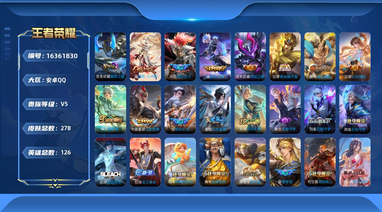 [16361830]【店主推荐捡漏号!可直接换绑】安卓Q-V5-最强王者段位-126英雄-278皮肤-12传说-88史诗-1星元 【英雄全皮】:戈娅全皮,空空儿全皮,影全皮 【传说皮肤】:后羿神树通天,澜愿照九州拓,云缨幻光神枪,桑启鸣野蒿,马超琥珀纪元,铠琥珀纪元,澜逐花归海,吕布遇见神鼓,干将莫邪久胜战神,虞姬云霓雀翎,达摩黄金狮子座,宫本武藏地狱之眼 【限定皮肤】:暃埋骨钱,蒙犽顽岩魄,蔡文姬夏日便利店,大乔绒语心约,虞姬夏日便利店,姜子牙天穹之誓,杨戬破阵退雄兵,李白谪仙醉月,狄仁杰阴阳师,赵云皇家上将,赵云百木心枪,阿轲迷踪丽影,钟无艳王者之锤,芈月白晶晶,吕布猎兽之王,吕布遇见神鼓,元歌云间偶戏,元歌无心,夏侯惇匿光决锋者,典韦蓝屏警告,马可波罗山海玄木吟,狄仁杰魔术师,达摩星际陆战队,项羽海滩派对,韩信傲雪梅枪,孙悟空美猴王,孙悟空孙行者,后羿如梦令,刘备百相守梦,李元芳云中旅人,鬼谷子五谷丰年,百里玄策原初追逐者,沈梦溪大漠名商,裴擒虎李小龙,裴擒虎擒涛扼浪,云中君纤云弄巧,嫦娥拒霜思,嫦娥暖冬兔眠,西施玲珑珍味,蒙犽狂想玩偶喵,鲁班大师探海日志,桑启海盐诗旅,戈娅驭风魔法,艾琳流音漫舞,司空震地狱燃心,阿古朵江河有灵,张良古海寻踪,蒙犽百解令,高渐离燃音魔法,妲己灵卜魔法,鬼谷子天穹祈灯,铠琥珀纪元,马超琥珀纪元,姬小满妄想食味,沈梦溪龙舞盛年,鲁班七号蔬乡物语,李元芳蔬乡物语,刘邦剑破天穹,程咬金群星魔术团,镜青焰无极,项羽苍威无极,刘备异域游侠,周瑜熔金海岸 【年限皮肤】:孙悟空美猴王,马可波罗山海玄木吟 【赛季限定】:张良古海寻踪,李元芳云中旅人,百里玄策原初追逐者,沈梦溪大漠名商,裴擒虎擒涛扼浪,鲁班大师探海日志,桑启海盐诗旅,鬼谷子天穹祈灯,刘邦剑破天穹,姜子牙天穹之誓 【战令限定】:蔡文姬夏日便利店,虞姬夏日便利店,阿轲迷踪丽影,吕布猎兽之王,元歌云间偶戏,典韦蓝屏警告,达摩星际陆战队,艾琳流音漫舞,嫦娥暖冬兔眠,西施玲珑珍味,蒙犽狂想玩偶喵,司空震地狱燃心,戈娅驭风魔法,高渐离燃音魔法,妲己灵卜魔法,鲁班七号蔬乡物语,李元芳蔬乡物语,镜青焰无极,项羽苍威无极 【史诗皮肤】:露娜紫霞仙子,阿轲暗夜猫娘,钟无艳王者之锤,赵云皇家上将,赵云未来纪元,甄姬冰雪圆舞曲,王昭君偶像歌手,狄仁杰魔术师,廉颇地狱岩魂,宫本武藏鬼剑武藏,孙尚香水果甜心,嬴政摇滚巨星,妲
