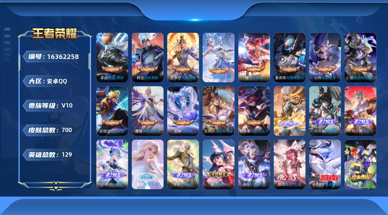 - [12025828]V8 1典藏 1珍品传说 19传说 124英雄 270皮肤 可修改实名 优质装备:弑枪猎影(韩信典藏),云鹰飞将(小将军),久胜战神,一念神魔,仲夏夜之梦(大飞蛾),零号·赤焰,时之恋人-刘备(电焊工),挚爱之约,无双飞将,音你闪耀(rap皮),黄金天蝎座 珍品传说:时之奇旅-孙策 传说皮:乘龙·淬吴钩(孙策年限),典韦战鼓燎原,幻光神枪 珍宝阁皮:妄想食味,优雅恋人,玩趣恶龙 限定皮:鸣野蒿,武陵仙君(小桃花),傲雪梅枪,寅虎·展翼(孙膑年限),高山流水,五谷丰年,梁祝,李小龙,玄武志(苏烈年限),如梦令-后羿,猪悟能,冰霜恋舞曲,匿光追影者,寅虎·御盾(廉颇年限),寅虎·瑞焰(虎皮蛋子),寅虎·心曲(虎婆),寅虎·赤拳(老虎年限),时之祈愿-云中君,枫霜尽,山海·玄木吟(马可年限) 史诗皮:化蝶舞,星界战将,海诺心动手记,破空之剑,涂山红红,东方月初,埋骨钱,奇遇星旅,蔬乡物语(鲁班七号),遇见神鹿,紫霞仙子,苍穹之光,电玩小子(小书包),黄金分割率,特工魅影,永昼,百相守梦(关羽),江河有灵,百解令(蒙犽),高渐离燃音魔法,蒙恬荣光圣徽,偶像歌手,无限星赏官,冰冠公主,青蛇,末日机甲-吕布,猫狗日记-孙策,猫狗日记-大乔,时之恋人-孙尚香,乱世虎臣,节奏热浪,修罗,摇滚巨星,水果甜心,绅士熊喵,星夜王子,功夫厨神,德古拉伯爵,暗隐猎兽者,幽灵船长,鬼剑武藏,心灵战警,舞动绿茵,地狱岩魂,繁星吟游(呼啦呼啦),拒霜思,缤纷独角兽,乘风破浪,逐浪之夏,龙鼓争鸣,水晶猎龙者,曙光守护者,金属风暴,原初追逐者,圣诞恋歌,鹰眼统帅,魅力维加斯,赏金猎手,奇遇舞章,寅虎·御盾,无心
