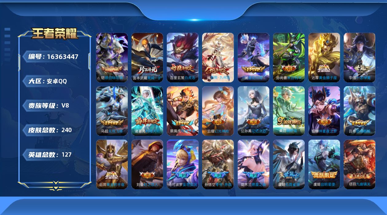 [16363447]可二次【特价出售/店主推荐,打野37段,发育路34段,1市标】安卓Q-V8-至尊星耀I段位-127英雄-240皮肤-1星传说-1典藏皮肤-1珍品传说-21传说-73史诗 【英雄全皮】:空空儿全皮 【荣耀典藏】:铠银白咏叹调 【珍品传说】:宫本武藏黑崎一护 【传说皮肤】:澜愿照九州拓,云缨幻光神枪,裴擒虎祥瑞亨通,桑启鸣野蒿,澜逐花归海,马可波罗妄想实况,公孙离记忆之芯,花木兰燃星之曲,吕布怒海麟威,马超无双飞将,诸葛亮时雨天司,虞姬启明星使,孙悟空零号赤焰,李信一念神魔,刘备时之恋人,虞姬云霓雀翎,达摩黄金狮子座,百里玄策白虎志,后羿黄金射手座,貂蝉仲夏夜之梦,孙尚香末日机甲 【限定皮肤】:蒙犽顽岩魄,蔡文姬夏日便利店,虞姬夏日便利店,姜子牙天穹之誓,狄仁杰阴阳师,赵云皇家上将,孙尚香蔷薇恋人,鲁班七号狮舞东方,庄周高山流水,钟无艳王者之锤,元歌无心,马可波罗妄想实况,狄仁杰魔术师,狄仁杰万华元夜,达摩沙漠行僧,项羽海滩派对,老夫子醍醐杖,程咬金演武夺筹,兰陵王金庭之子,花木兰燃星之曲,亚瑟潮玩骑士王,孙悟空至尊宝,孙悟空大圣娶亲,孙悟空零号赤焰,孙悟空孙行者,虞姬启明星使,钟馗驱傩正仪,雅典娜黎明之约,鬼谷子原初探秘者,诸葛亮时雨天司,苏烈千军破阵,百里玄策白虎志,百里玄策原初追逐者,梦奇顽趣,明世隐疑决卦,裴擒虎李小龙,嫦娥拒霜思,西施玲珑珍味,蒙犽狂想玩偶喵,鲁班大师探海日志,阿古朵江河有灵,张良古海寻踪,蒙恬荣光圣徽,鬼谷子天穹祈灯,沈梦溪龙舞盛年,鲁班七号蔬乡物语,李元芳蔬乡物语,刘邦剑破天穹,程咬金群星魔术团,镜青焰无极,项羽苍威无极,芈月浮光幕影,周瑜熔金海岸 【年限皮肤】:百里玄策白虎志,诸葛亮时雨天司,澜愿照九州拓 【赛季限定】:明世隐疑决卦,老夫子醍醐杖,鬼谷子原初探秘者,狄仁杰万华元夜,程咬金演武夺筹,钟馗驱傩正仪,苏烈千军破阵,达摩沙漠行僧,兰陵王金庭之子,鲁班大师探海日志,张良古海寻踪,鬼谷子天穹祈灯,刘邦剑破天穹,姜子牙天穹之誓,东皇太一噬灭天穹,太乙真人谧流熔炉,钟馗虚灵犬护,甄姬逆浪荇歌,亚瑟荣光之誓,百里玄策原初追逐者,雅典娜黎明之约,梦奇顽趣,蒙恬荣光圣徽,牛魔星界战将,项羽九幽镇关 【战令限定】:鲁班七号狮舞东方,蒙犽狂想玩偶喵,亚瑟潮玩骑士王,西施玲珑珍味,鲁班七号蔬乡物语,李元芳蔬乡物语,镜青焰无极,项羽苍威无极,蔡文姬夏