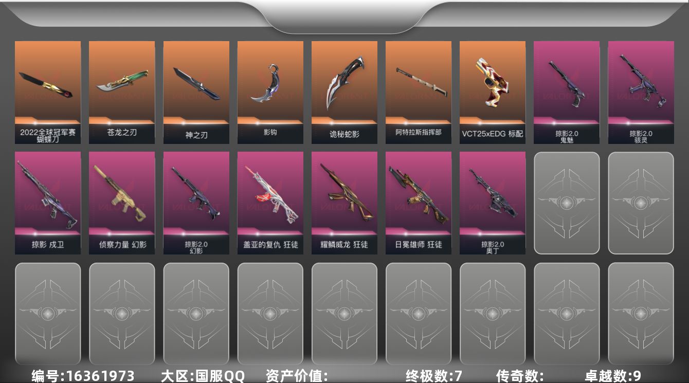 [16361973]【套装】:掠影//2.0套装 【英雄】:幻棱,炼狱,维斯,暮蝶,壹决,铁臂,捷风,雷兹,幽影,不死鸟,贤者,猎枭,零,芮娜,奇乐,尚勃勒,霓虹,斯凯,夜露,K/O,盖可,黑梦,钢锁 【近战武器】:近战武器-2022全球冠军赛 蝴蝶刀,近战武器-影钩,近战武器-5周年//公测重制版 苍龙之刃,近战武器-神之刃,近战武器-诡秘蛇影 军刀,近战武器-阿特拉斯指挥部 甩棍 【狂徒】:狂徒-盖亚的复仇,狂徒-日冕雄师,狂徒-耀鳞威龙,狂徒-诡秘蛇影 【幻影】:幻影-侦察力量,幻影-掠影//2.0,幻影-末日之翼 【戍卫】:戍卫-掠影,戍卫-折光棱晶 【飞将】:飞将-末日之翼 【莽侠】:莽侠-诡秘蛇影 【奥丁】:奥丁-掠影//2.0,奥丁-末日之翼 【判官】:判官-诡秘蛇影 【骇灵】:骇灵-掠影//2.0 【蜂刺】:蜂刺-折光棱晶 【标配】:标配-折光棱晶 【VCT手枪】:标配-VCT25 x EDG 【鬼魅】:鬼魅-掠影//2.0,鬼魅-诡秘蛇影 【短炮】:短炮-末日之翼 【卡面】:南瓜盛典 卡面,树懒大作战 卡面,Clutch 卡面,无畏契约GO!第一卷:芮娜 卡面,无畏契约GO!第一卷:零 卡面,《双城之战》金克丝 卡面,战术小伙伴 卡面,钢锁vs盖可 卡面,代号红色 卡面,新兵报到 卡面,V契约 卡面,无畏契约 卡面 【喷漆】:霓光四射 喷漆,买装还是存钱 喷漆,关门放狗 喷漆,放下武器 喷漆,胜利属于无畏契约 喷漆,GLHF 喷漆,无畏契约 喷漆 【挂饰】:无畏契约GO!第一卷 芮娜 挂饰,无畏契约GO!第一卷 零 挂饰,VCT x EDG 挂饰,天外飞客 挂饰,无畏契约 纪念币 挂饰