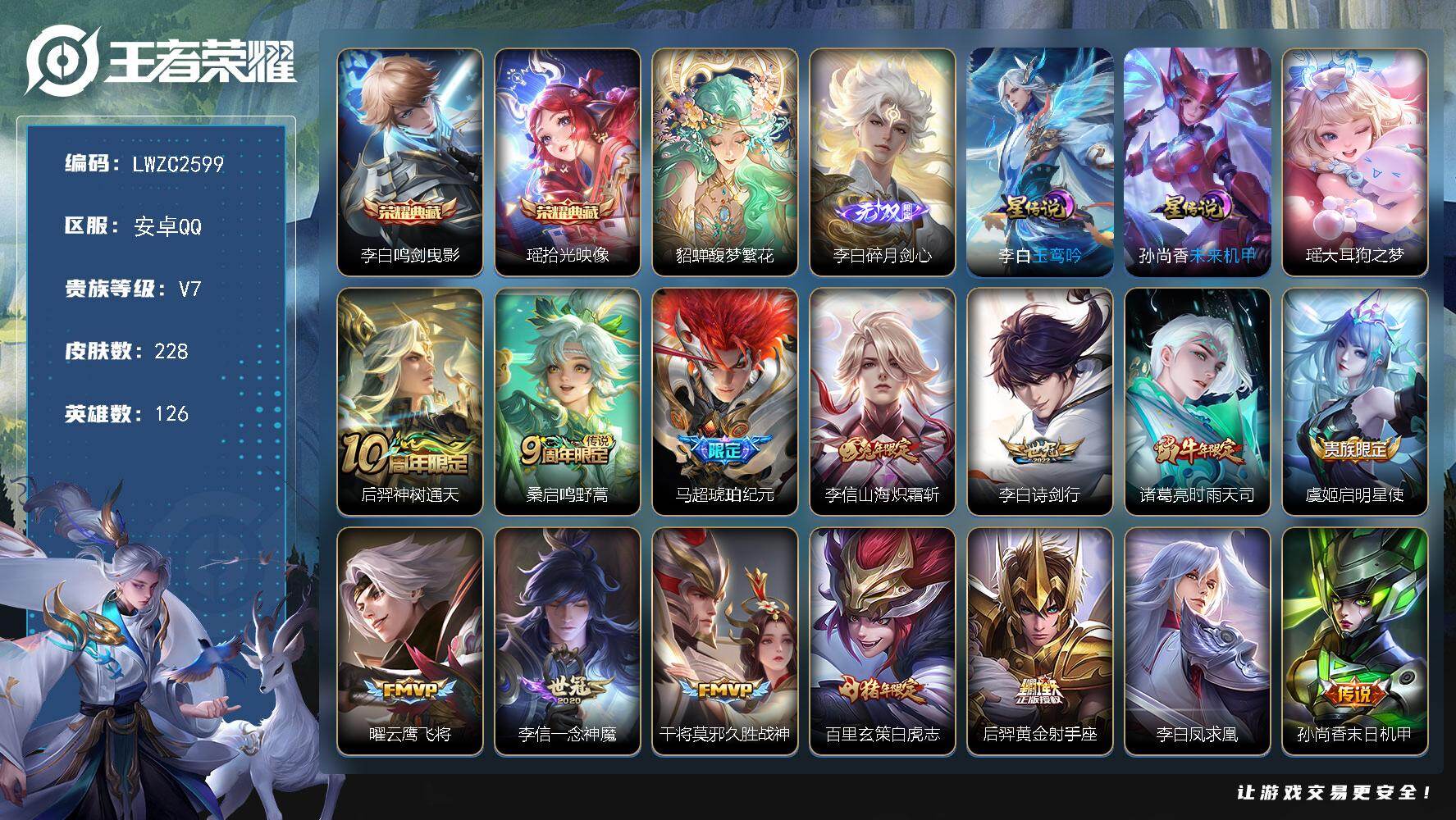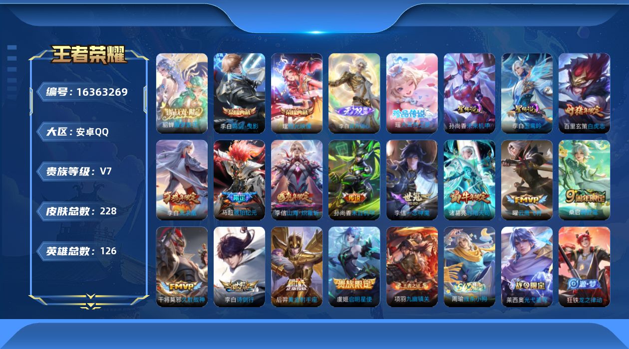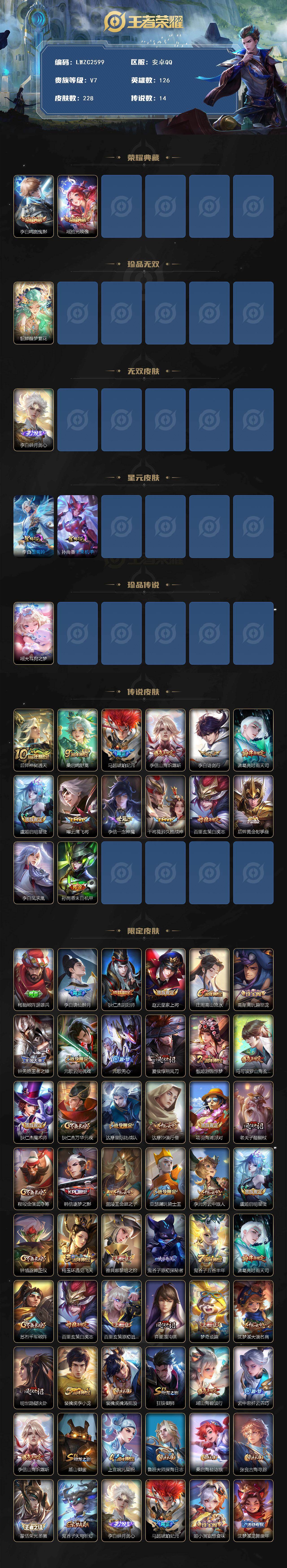 [16363269]可二次【特价出售/店主推荐,李信小国,8万战,对抗路73段,打野42段,6省标,10市标】万战李信,万战元歌,万战项羽,万战花木兰,,万战司空震,万战马可波罗,万战马超,万战韩信,,安卓Q-V7-最强王者段位-126英雄-228皮肤-2典藏皮肤-1珍品无双-2星传说-1无双-1珍品传说-14传说-68史诗 【英雄全皮】:李白全皮,孙权全皮,李信全皮,影全皮 【荣耀典藏】:李白鸣剑曳影,瑶拾光映像 【珍品无双】:貂蝉馥梦繁花 【无双皮肤】:李白碎月剑心 【珍品传说】:瑶大耳狗之梦 【传说皮肤】:后羿神树通天,桑启鸣野蒿,马超琥珀纪元,李信山海炽霜斩,李白诗剑行,诸葛亮时雨天司,虞姬启明星使,曜云鹰飞将,李信一念神魔,干将莫邪久胜战神,百里玄策白虎志,后羿黄金射手座,李白凤求凰,孙尚香末日机甲 【限定皮肤】:杨戬破阵退雄兵,李白谪仙醉月,狄仁杰阴阳师,赵云皇家上将,庄周高山流水,高渐离玩趣恶龙,钟无艳王者之锤,元歌云间偶戏,元歌无心,夏侯惇朔风刀,甄姬游园惊梦,马可波罗山海玄木吟,狄仁杰魔术师,狄仁杰万华元夜,达摩星际陆战队,达摩沙漠行僧,项羽海滩派对,老夫子醍醐杖,程咬金演武夺筹,韩信逐梦之影,兰陵王金庭之子,亚瑟潮玩骑士王,李元芳云中旅人,虞姬启明星使,钟馗驱傩正仪,杨玉环遇见飞天,雅典娜黎明之约,鬼谷子原初探秘者,鬼谷子五谷丰年,诸葛亮时雨天司,苏烈千军破阵,百里玄策白虎志,百里玄策原初追逐者,弈星混沌棋,梦奇顽趣,沈梦溪大漠名商,明世隐疑决卦,裴擒虎李小龙,裴擒虎擒涛扼浪,狂铁御狮,瑶山海碧波行,云中君纤云弄巧,李信山海炽霜斩,盾山御銮,上官婉儿梁祝,鲁班大师探海日志,桑启海盐诗旅,张良古海寻踪,蒙恬荣光圣徽,鬼谷子天穹祈灯,李白碎月剑心,马超琥珀纪元,姬小满妄想食味,沈梦溪龙舞盛年,刘邦剑破天穹,程咬金群星魔术团,镜青焰无极,项羽苍威无极 【年限皮肤】:李白凤求凰,百里玄策白虎志,诸葛亮时雨天司,李信山海炽霜斩,瑶山海碧波行,马可波罗山海玄木吟 【赛季限定】:狂铁御狮,盾山御銮,夏侯惇朔风刀,弈星混沌棋,明世隐疑决卦,老夫子醍醐杖,鬼谷子原初探秘者,狄仁杰万华元夜,程咬金演武夺筹,钟馗驱傩正仪,苏烈千军破阵,达摩沙漠行僧,兰陵王金庭之子,沈梦溪大漠名商,李元芳云中旅人,桑启海盐诗旅,裴擒虎擒涛扼浪,鲁班大师探海日志,张良古海寻踪,鬼谷子天穹祈灯,刘邦剑破天穹