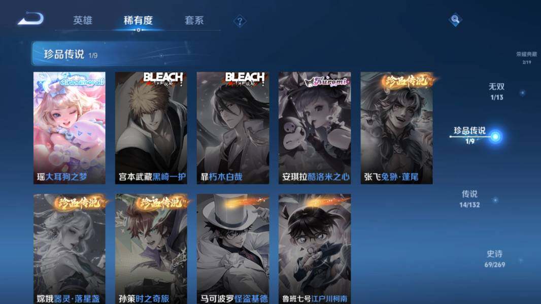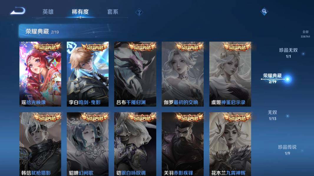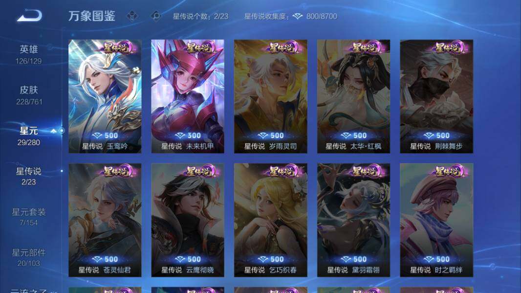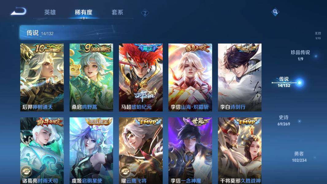 【传说皮肤】:后羿神树通天,桑启鸣野蒿,马超琥珀纪元,李信山海炽霜斩,李白诗剑行,诸葛亮时雨天司,虞姬启明星使,曜云鹰飞将,李信一念神魔,干将莫邪久胜战神,百里玄策白虎志,后羿黄金射手座,李白凤求凰,孙尚香末日机甲