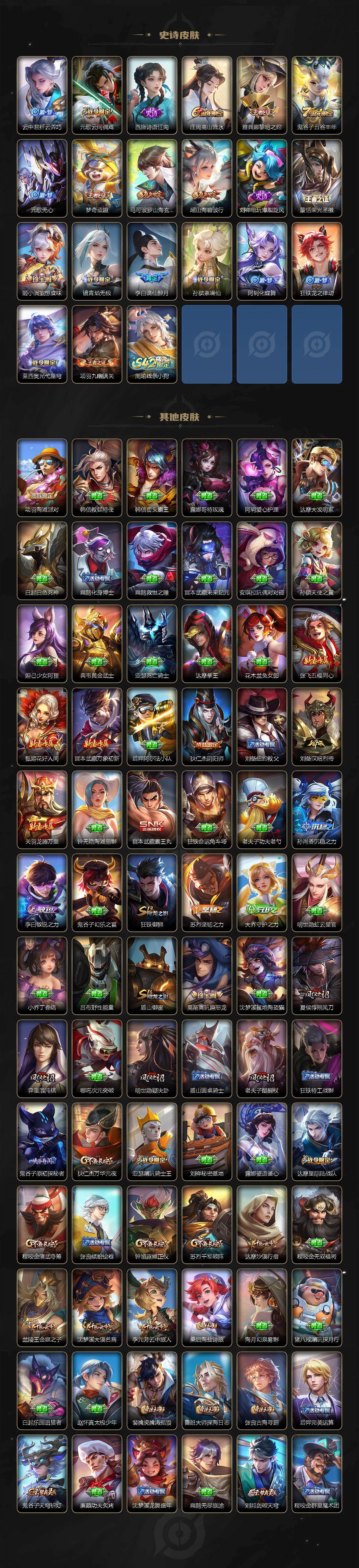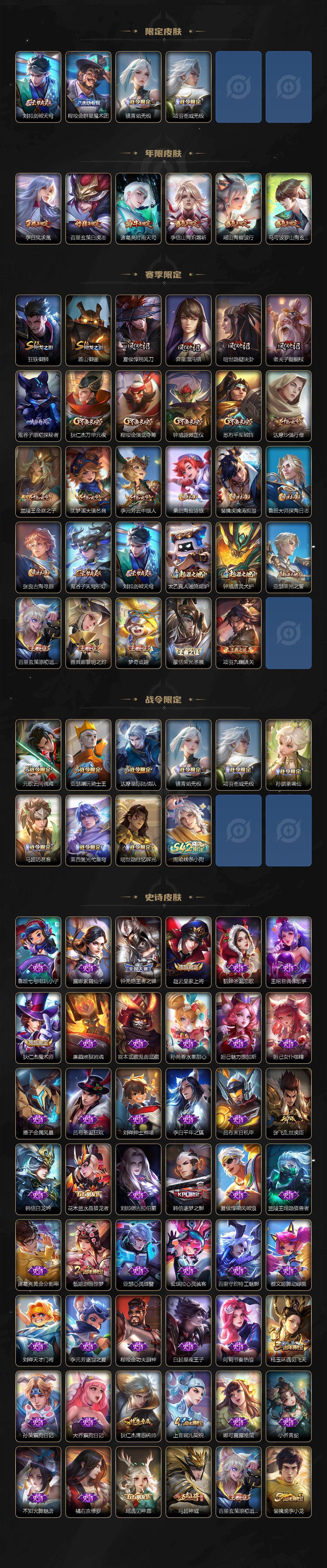 【赛季限定】:狂铁御狮,盾山御銮,夏侯惇朔风刀,弈星混沌棋,明世隐疑决卦,老夫子醍醐杖,鬼谷子原初探秘者,狄仁杰万华元夜,程咬金演武夺筹,钟馗驱傩正仪,苏烈千军破阵,达摩沙漠行僧,兰陵王金庭之子,沈梦溪大漠名商,李元芳云中旅人,桑启海盐诗旅,裴擒虎擒涛扼浪,鲁班大师探海日志,张良古海寻踪,鬼谷子天穹祈灯,刘邦剑破天穹