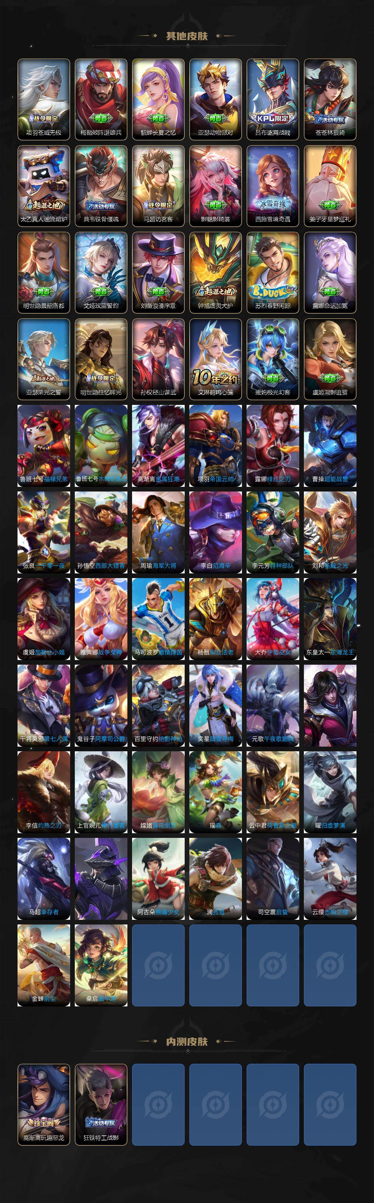 【限定皮肤】:杨戬破阵退雄兵,李白谪仙醉月,狄仁杰阴阳师,赵云皇家上将,庄周高山流水,高渐离玩趣恶龙,钟无艳王者之锤,元歌云间偶戏,元歌无心,夏侯惇朔风刀,甄姬游园惊梦,马可波罗山海玄木吟,狄仁杰魔术师,狄仁杰万华元夜,达摩星际陆战队,达摩沙漠行僧,项羽海滩派对,老夫子醍醐杖,程咬金演武夺筹,韩信逐梦之影,兰陵王金庭之子,亚瑟潮玩骑士王,李元芳云中旅人,虞姬启明星使,钟馗驱傩正仪,杨玉环遇见飞天,雅典娜黎明之约,鬼谷子原初探秘者,鬼谷子五谷丰年,诸葛亮时雨天司,苏烈千军破阵,百里玄策白虎志,百里玄策原初追逐者,弈星混沌棋,梦奇顽趣,沈梦溪大漠名商,明世隐疑决卦,裴擒虎李小龙,裴擒虎擒涛扼浪,狂铁御狮,瑶山海碧波行,云中君纤云弄巧,李信山海炽霜斩,盾山御銮,上官婉儿梁祝,鲁班大师探海日志,桑启海盐诗旅,张良古海寻踪,蒙恬荣光圣徽,鬼谷子天穹祈灯,李白碎月剑心,马超琥珀纪元,姬小满妄想食味,沈梦溪龙舞盛年,刘邦剑破天穹,程咬金群星魔术团,镜青焰无极,项羽苍威无极
