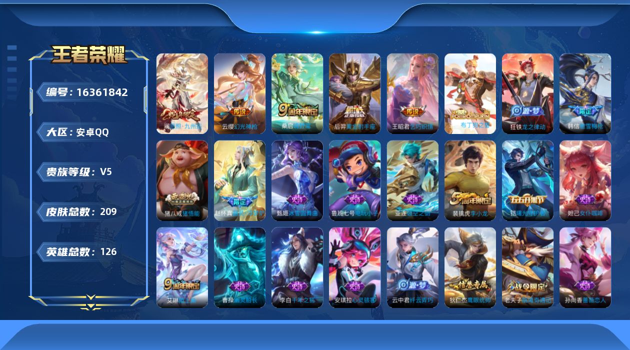 [16361842]【店主推荐捡漏号!可直接换绑】安卓Q-V5-永恒钻石III段位32段发育路-126英雄-209皮肤-5传说-45史诗-1星元 【传说皮肤】:澜愿照九州拓,云缨幻光神枪,桑启鸣野蒿,王昭君乞巧织情,后羿黄金射手座 【限定皮肤】:姜子牙天穹之誓,狄仁杰阴阳师,赵云皇家上将,墨子神迹守卫,孙尚香蔷薇恋人,高渐离死亡摇滚,钟无艳王者之锤,夏侯惇朔风刀,曹操烛龙,典韦穷奇,狄仁杰万华元夜,达摩沙漠行僧,项羽海滩派对,老夫子醍醐杖,老夫子航海奇遇记,程咬金演武夺筹,韩信傲雪梅枪,兰陵王金庭之子,牛魔御旌,李元芳云中旅人,钟馗驱傩正仪,雅典娜单词大作战,雅典娜黎明之约,鬼谷子原初探秘者,苏烈千军破阵,百里玄策原初追逐者,弈星混沌棋,梦奇顽趣,沈梦溪大漠名商,明世隐疑决卦,裴擒虎李小龙,裴擒虎擒涛扼浪,米莱狄御霄,云中君纤云弄巧,盾山御銮,猪八戒猪悟能,上官婉儿梁祝,蒙犽狂想玩偶喵,鲁班大师探海日志,桑启海盐诗旅,艾琳女武神,阿古朵江河有灵,张良古海寻踪,鬼谷子天穹祈灯,沈梦溪龙舞盛年,刘邦剑破天穹 【赛季限定】:夏侯惇朔风刀,曹操烛龙,典韦穷奇,狄仁杰万华元夜,达摩沙漠行僧,老夫子醍醐杖,程咬金演武夺筹,兰陵王金庭之子,张良古海寻踪,牛魔御旌,李元芳云中旅人,钟馗驱傩正仪,雅典娜黎明之约,鬼谷子原初探秘者,苏烈千军破阵,百里玄策原初追逐者,弈星混沌棋,梦奇顽趣,沈梦溪大漠名商,明世隐疑决卦,裴擒虎擒涛扼浪,米莱狄御霄,盾山御銮,鲁班大师探海日志,桑启海盐诗旅,鬼谷子天穹祈灯,刘邦剑破天穹,姜子牙天穹之誓 【战令限定】:墨子神迹守卫,老夫子航海奇遇记,雅典娜单词大作战,蒙犽狂想玩偶喵 【史诗皮肤】:鲁班七号电玩小子,钟无艳王者之锤,赵云皇家上将,赵云未来纪元,甄姬冰雪圆舞曲,廉颇地狱岩魂,宫本武藏鬼剑武藏,孙尚香蔷薇恋人,孙尚香水果甜心,嬴政暗夜贵公子,嬴政摇滚巨星,妲己女仆咖啡,墨子金属风暴,吕布圣诞狂欢,刘禅绅士熊喵,曹操幽灵船长,李白千年之狐,张飞乱世虎臣,兰陵王暗隐猎兽者,亚瑟心灵战警,安琪拉心灵骇客,百里守约特工魅影,铠曙光守护者,蔡文姬舞动绿茵,李元芳逐浪之夏,程咬金功夫厨神,孙策猫狗日记,伽罗箭羽风息,狄仁杰鹰眼统帅,上官婉儿梁祝,蒙犽狂想玩偶喵,百里玄策原初追逐者,裴擒虎李小龙,云中君纤云弄巧,老夫子航海奇遇记,猪八戒猪悟能,雅典娜黎明之约,韩信傲雪梅枪,梦奇顽趣