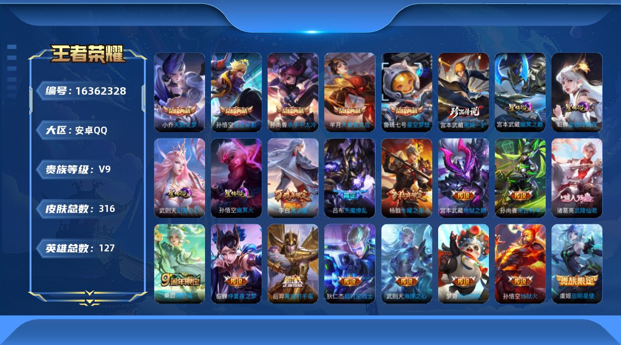 [16362328]【店主推荐捡漏号!可直接换绑】安卓Q-V9-至尊星耀III段位-127英雄-316皮肤-5典藏皮肤-1典藏英雄-1珍品传说-14传说-81史诗-4星元 【英雄全皮】:孙权全皮 【荣耀典藏】:武则天英雄,孙悟空全息碎影,小乔天鹅之梦,孙尚香杀手不太冷,鲁班七号星空梦想,芈月大秦宣太后 【珍品传说】:宫本武藏黑崎一护 【传说皮肤】:桑启鸣野蒿,虞姬启明星使,梦奇胖达荣荣,后羿黄金射手座,杨戬永曜之星,诸葛亮武陵仙君,貂蝉仲夏夜之梦,李白凤求凰,孙尚香末日机甲,宫本武藏地狱之眼,孙悟空地狱火,吕布天魔缭乱,武则天海洋之心,狄仁杰超时空战士 【限定皮肤】:白起狰,狄仁杰阴阳师,小乔纯白花嫁,虞姬凯尔特女王,赵云皇家上将,妲己热情桑巴,庄周蜃楼王,庄周云端筑梦师,庄周高山流水,高渐离死亡摇滚,高渐离玩趣恶龙,钟无艳王者之锤,孙膑妖精王,扁鹊炼金王,芈月重明,吕布天魔缭乱,周瑜真爱至上,夏侯惇朔风刀,甄姬游园惊梦,曹操烛龙,典韦穷奇,马可波罗逐梦之星,狄仁杰魔术师,狄仁杰万华元夜,达摩沙漠行僧,项羽海滩派对,项羽霸王别姬,老夫子醍醐杖,关羽冰锋战神,貂蝉逐梦之音,程咬金演武夺筹,韩信逐梦之影,兰陵王金庭之子,花木兰青春决赛季,孙悟空美猴王,孙悟空至尊宝,牛魔御旌,后羿辉光之辰,李元芳云中旅人,虞姬霸王别姬,虞姬启明星使,杨玉环遇见飞天,杨戬永曜之星,哪吒逐梦之翼,蔡文姬繁星吟游,太乙真人饕餮,鬼谷子原初探秘者,诸葛亮武陵仙君,苏烈千军破阵,弈星混沌棋,公孙离蜜橘之夏,沈梦溪大漠名商,明世隐疑决卦,裴擒虎李小龙,狂铁御狮,米莱狄御霄,云中君纤云弄巧,盾山御銮,上官婉儿梁祝,嫦娥拒霜思,鲁班大师探海日志,桑启海盐诗旅,阿古朵江河有灵,张良古海寻踪,裴擒虎梅西,沈梦溪龙舞盛年 【年限皮肤】:孙悟空美猴王,李白凤求凰,杨戬永曜之星,后羿辉光之辰 【赛季限定】:庄周蜃楼王,孙膑妖精王,扁鹊炼金王,虞姬凯尔特女王,白起狰,太乙真人饕餮,曹操烛龙,芈月重明,典韦穷奇,狂铁御狮,米莱狄御霄,牛魔御旌,盾山御銮,夏侯惇朔风刀,弈星混沌棋,明世隐疑决卦,老夫子醍醐杖,鬼谷子原初探秘者,狄仁杰万华元夜,程咬金演武夺筹,苏烈千军破阵,达摩沙漠行僧,兰陵王金庭之子,沈梦溪大漠名商,李元芳云中旅人,桑启海盐诗旅,鲁班大师探海日志,张良古海寻踪,东皇太一噬灭天穹,太乙真人谧流熔炉,钟馗虚灵犬护,甄姬逆浪荇