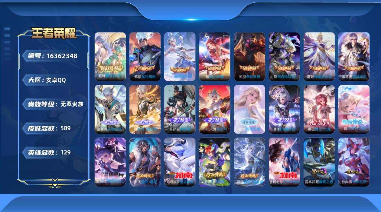 [16362348]【特价出售/店主推荐/1省标/6市标/38段中路/37段发育】:安卓Q-V11-永恒钻石I段位-129英雄-589皮肤-7典藏皮肤-1典藏英雄-1珍品无双-4星元-7无双-7珍品传说-67传说-195史诗 【英雄全皮】:廉颇全皮,嬴政全皮,刘禅全皮,阿轲全皮,钟无艳全皮,扁鹊全皮,白起全皮,司马懿全皮,老夫子全皮,关羽全皮,刘邦全皮,韩信全皮,孙权全皮,朵莉亚全皮,娜可露露全皮,橘右京全皮,刘备全皮,钟馗全皮,苍全皮,干将莫邪全皮,雅典娜全皮,太乙真人全皮,鬼谷子全皮,狂铁全皮,李信全皮,猪八戒全皮,亚连全皮,大司命全皮,西施全皮,蒙恬全皮,盘古全皮,阿古朵全皮,夏洛特全皮,司空震全皮,戈娅全皮,空空儿全皮,影全皮,海诺全皮,少司缘全皮 【荣耀典藏】:武则天英雄,诸葛亮星域神启,关羽赤影疾锋,铠银白咏叹调,韩信弑枪猎影,虞姬神鉴启示录,瑶拾光映像,伽罗最初的交响 【珍品无双】:貂蝉馥梦繁花 【无双皮肤】:妲己青丘九尾,韩信群星魔术团,不知火舞花合斗,公孙离离恨烟,甄姬雪境奇遇,曜器灵螭龙剑,诸葛亮天机白泽 【珍品传说】:马可波罗怪盗基德,鲁班七号江户川柯南,孙策时之奇旅,嫦娥器灵落星盏,张飞兔狲蓬尾,瑶大耳狗之梦,安琪拉酷洛米之心 【传说皮肤】:后羿神树通天,干将莫邪千山共赴,大司命死亡执政官,司马懿九山相柳,公孙离云诺千山,西施续相思,杨玉环星之鸣奏,后羿千劫归真,司空震愿照山河定,女娲愿照千秋盛,妲己愿照众生和,澜愿照九州拓,蔡文姬愿照福禄聚,虞姬愿照岁时盈,云缨幻光神枪,裴擒虎祥瑞亨通,嬴政玄雷天君,王昭君映山客,桑启鸣野蒿,庄周牧神诗旅,夏侯惇霜北刀,朵莉亚心动手记,云中君群星魔术团,海月金乌负日,亚连落雪白狼,吕布曦玄引,貂蝉曦玄引,孙尚香乘龙问璇玑,孙策乘龙淬吴钩,赵云乘龙铭钟鼎,艾琳觅芳踪,甄姬至美化雀舞,兰陵王影龙天霄,马可波罗妄想实况,诸葛亮鹤羽星尊,张飞百相守梦,夏洛特浮生妄,干将莫邪画中仙,花木兰燃星之曲,孙悟空齐天大圣,小乔山海琳琅生,李信山海炽霜斩,李白诗剑行,橘右京枫霜尽,娜可露露前尘镜,马超无双飞将,露娜启示之音,王昭君乞巧织情,西施游龙清影,李元芳飞鸢探春,镜炽阳神光,虞姬启明星使,关羽武圣,曜云鹰飞将,李信一念神魔,刘备时之恋人,干将莫邪久胜战神,虞姬云霓雀翎,百里玄策白虎志,花木兰冠军飞将,后羿黄金射手座,杨戬永曜之星,李白凤求