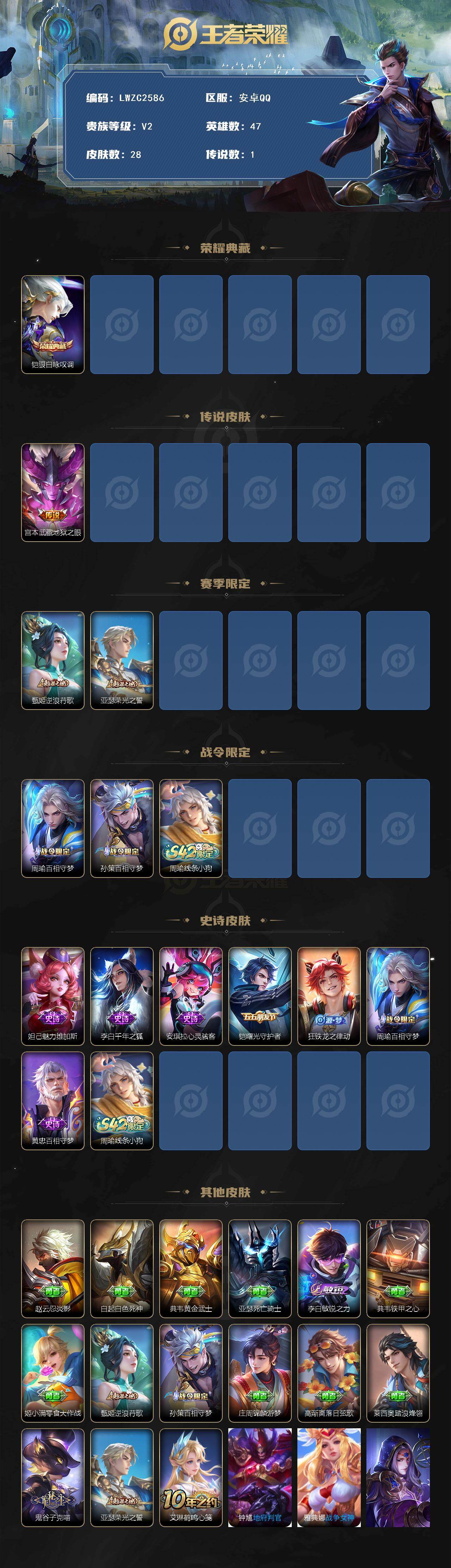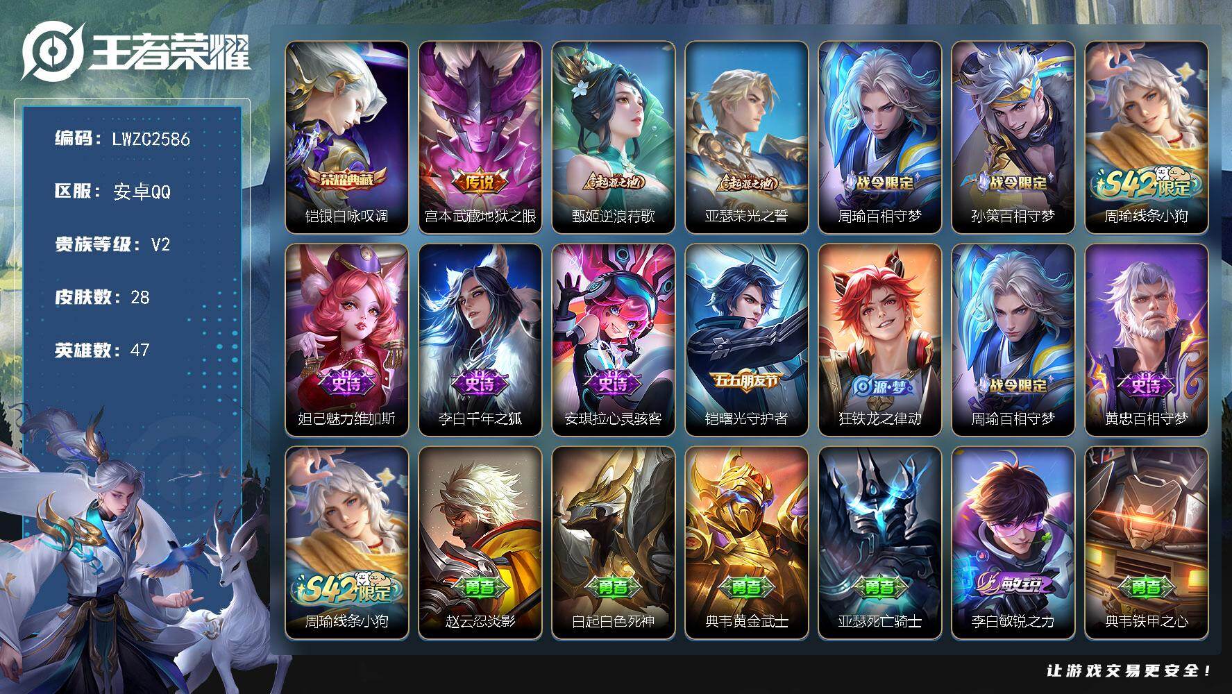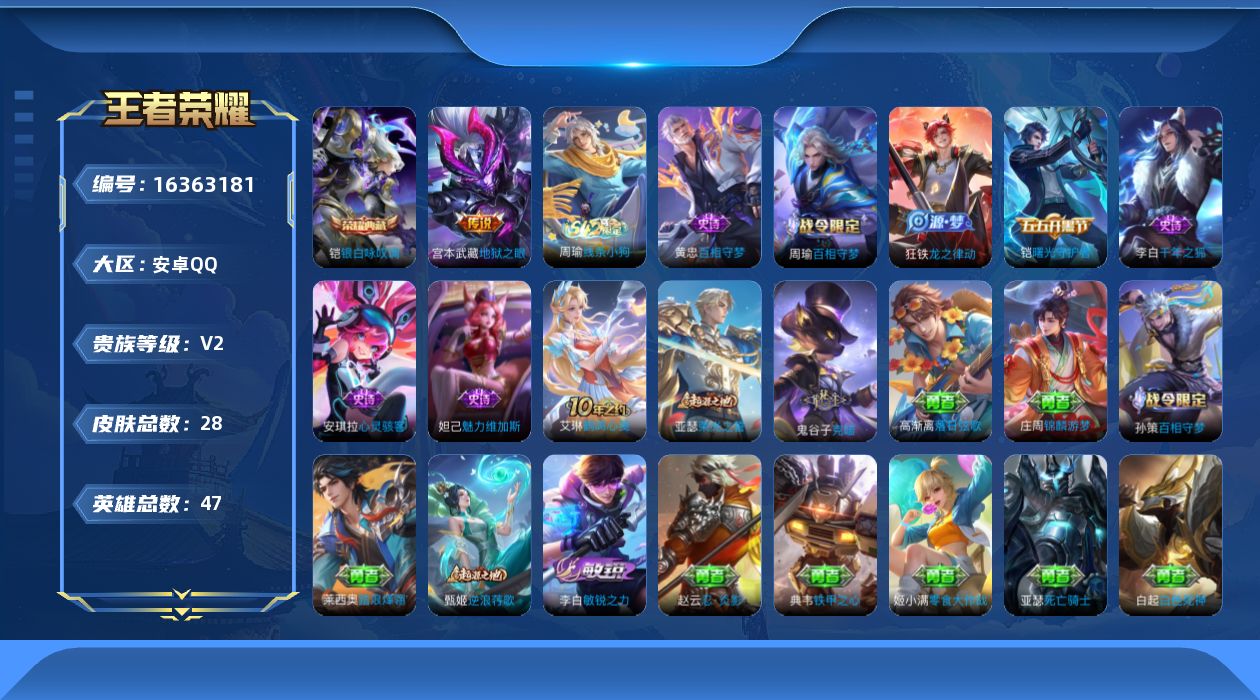 [16363181]【店主推荐捡漏号!可直接换绑】安卓Q-V3-尊贵铂金IV段位-47英雄-28皮肤-1典藏皮肤-1传说-7史诗