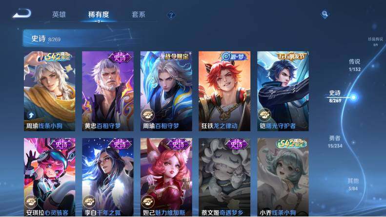 【史诗皮肤】:妲己魅力维加斯,李白千年之狐,安琪拉心灵骇客,铠曙光守护者,狂铁龙之律动,周瑜百相守梦,黄忠百相守梦,周瑜线条小狗